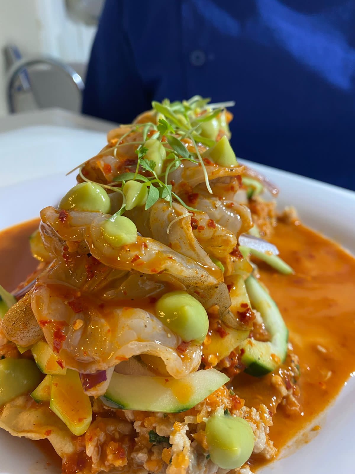 camaron curtido en aguachile rojo acompañado de verdura.
