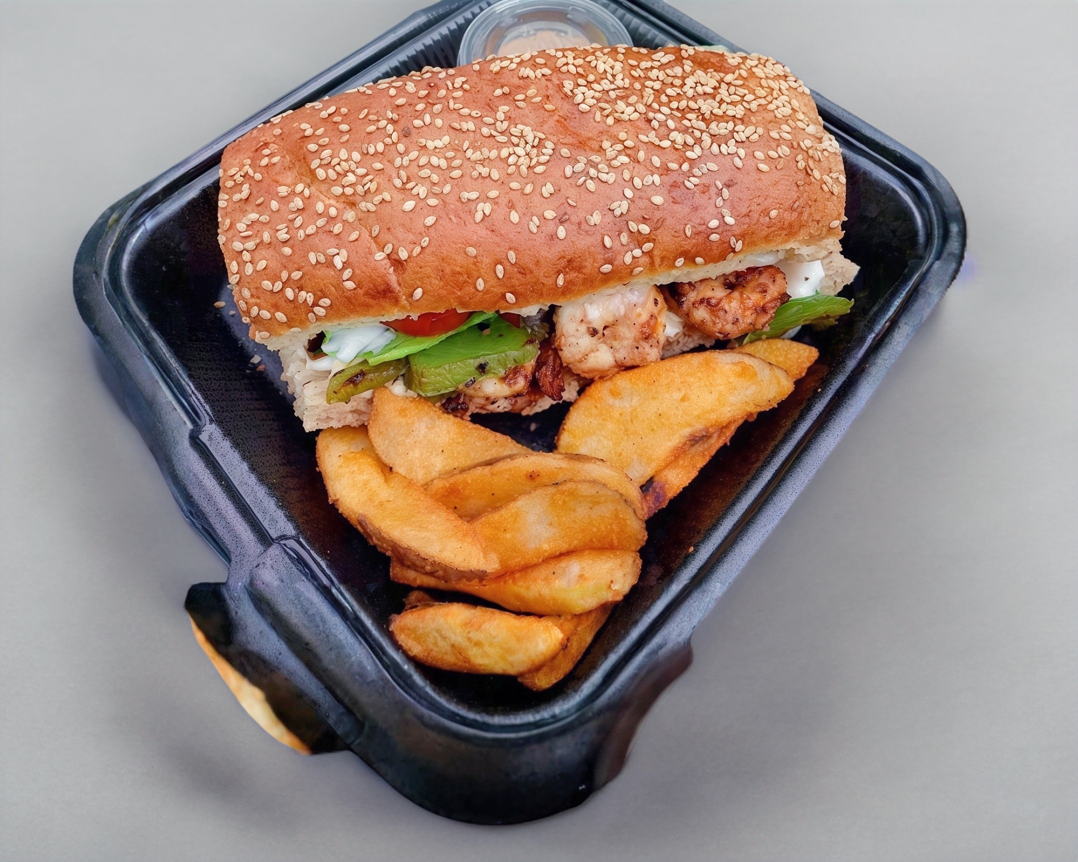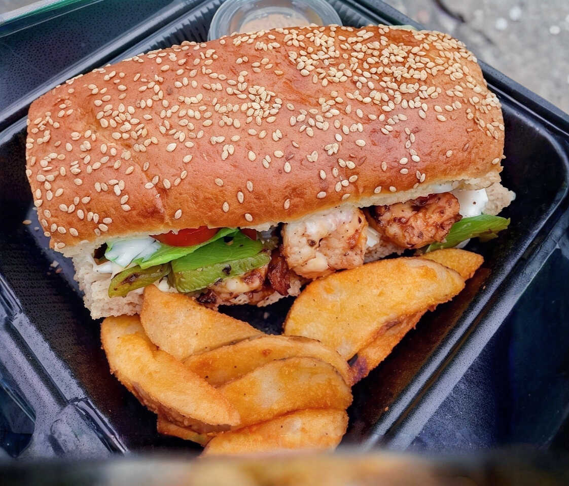 Baguette de camarones salteados con pimientos y cebolla, queso mozzarella, lechuga, jitomate, pepino, cebolla, germen, acompañado de papas gajo y aderezo chipotle ranch.