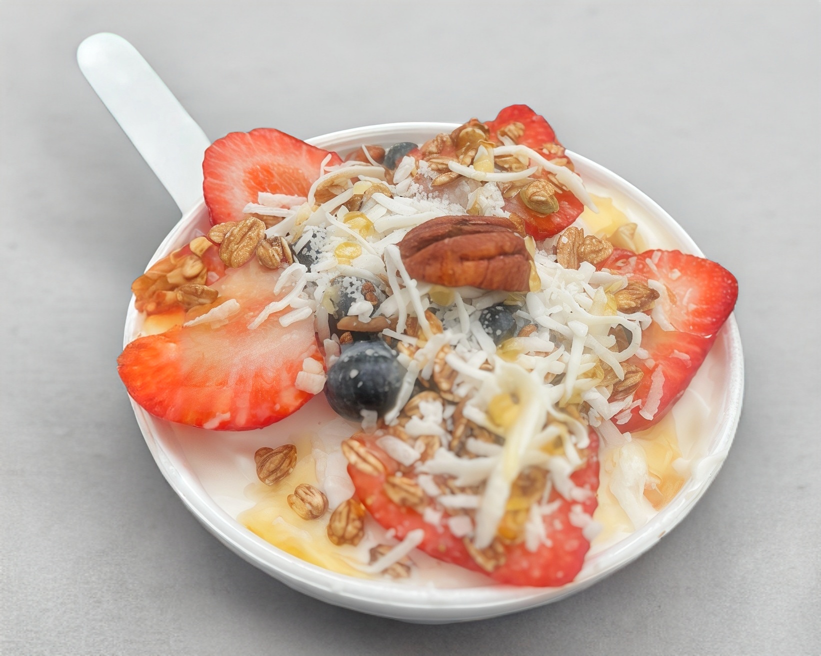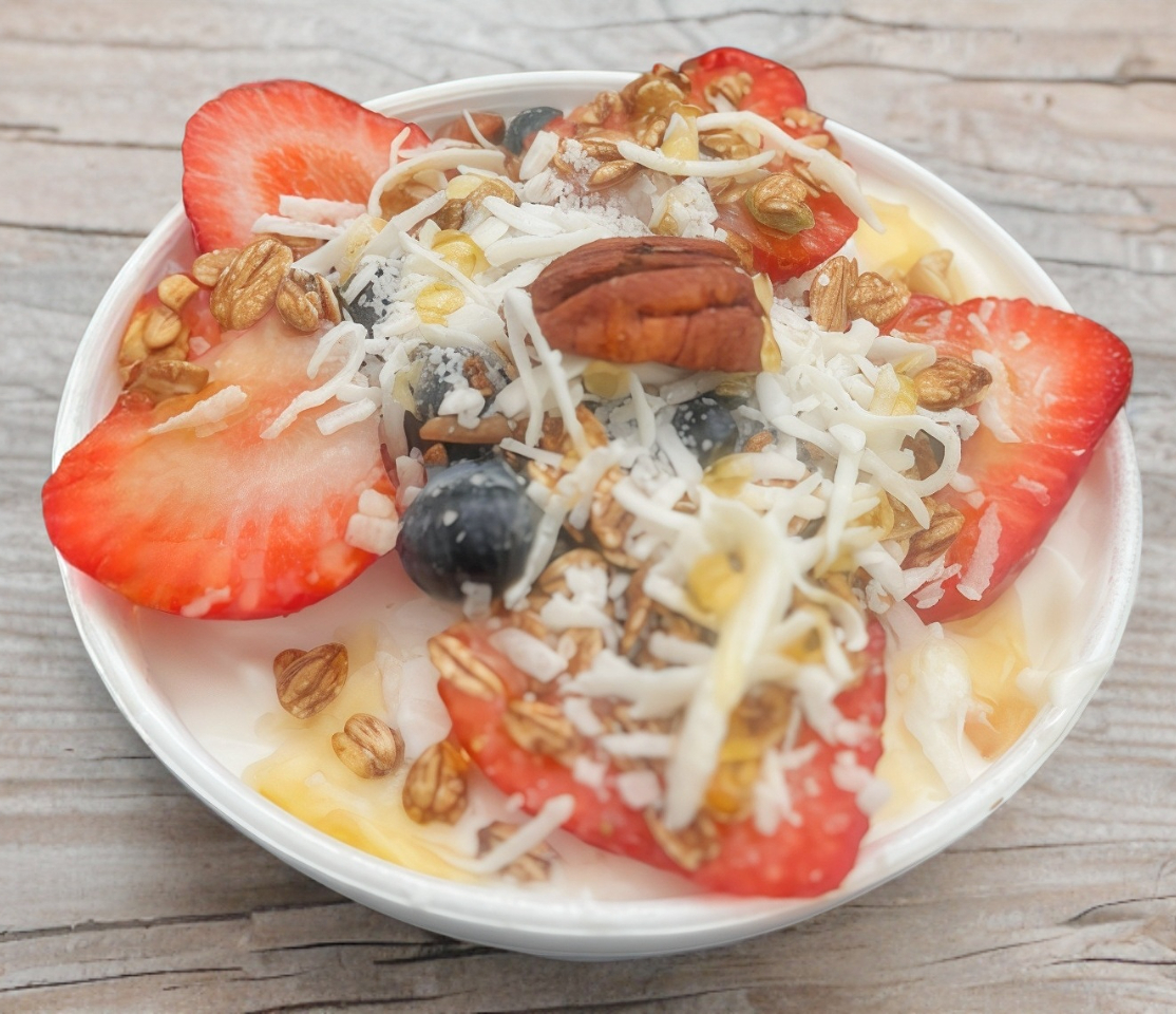 Preparado con crema de la casa, manzana, fresa, plátano, melón, papaya, cereales granola, nuez, almendras y coco, acompañado de miel de abeja.