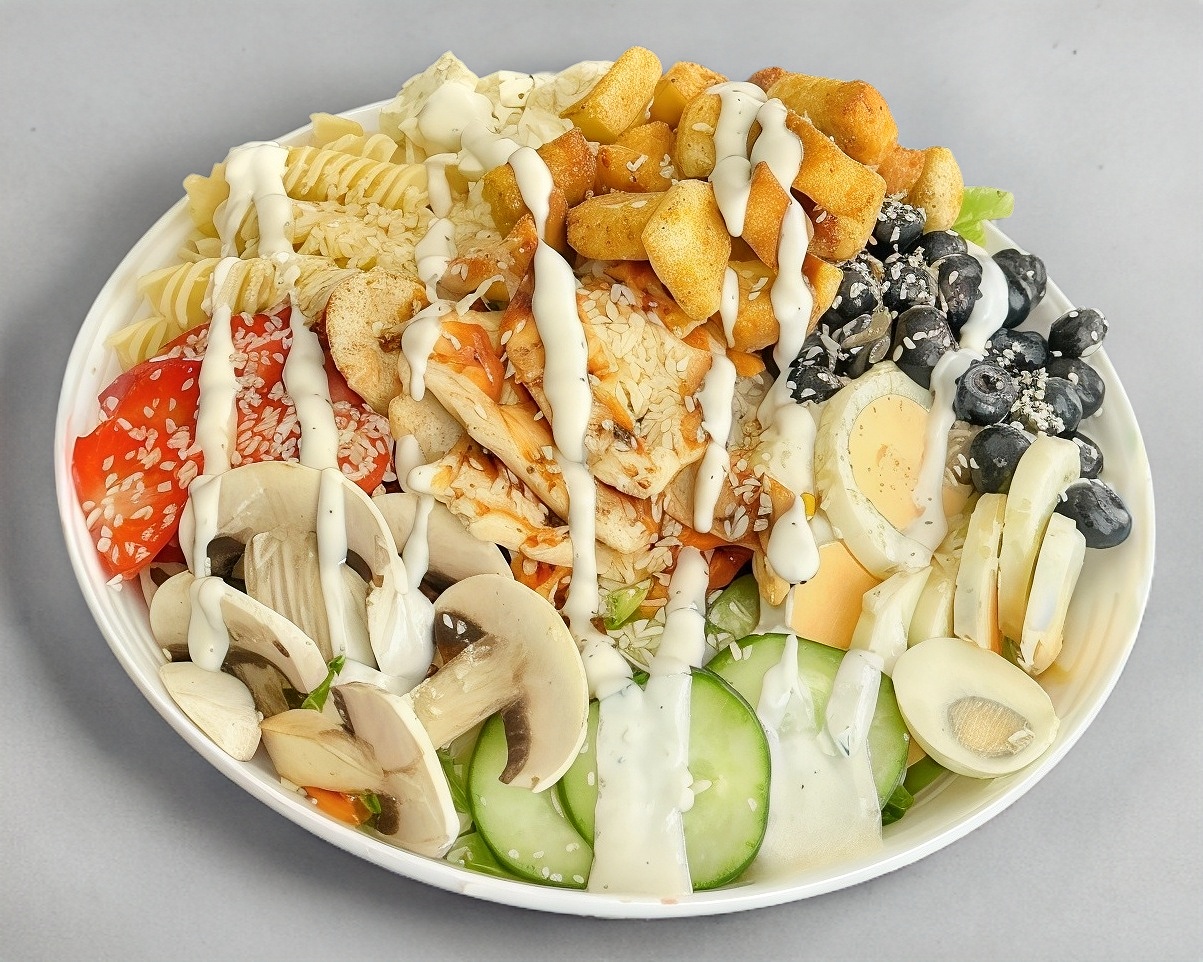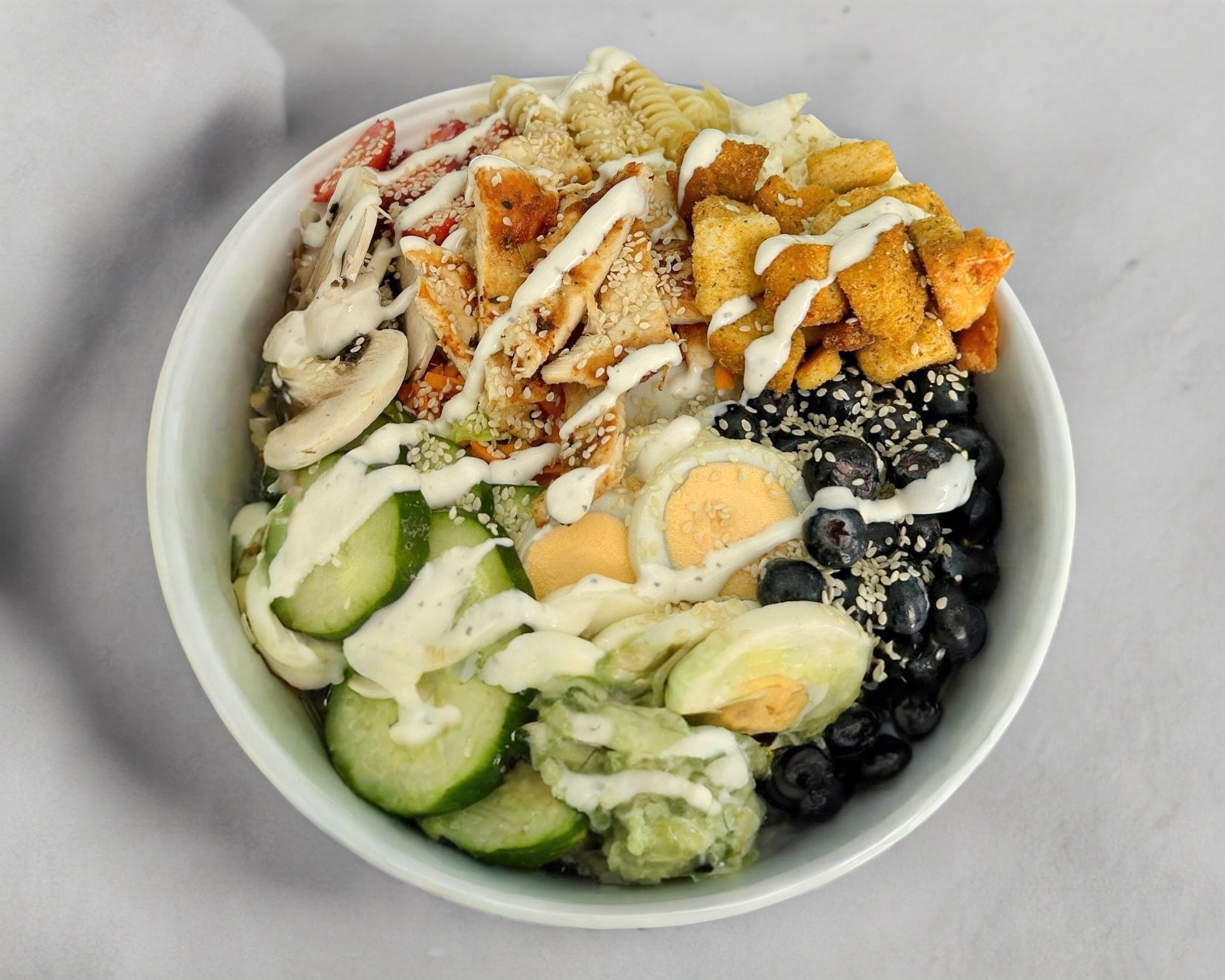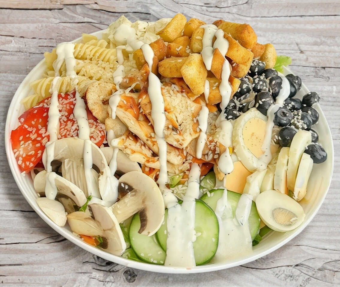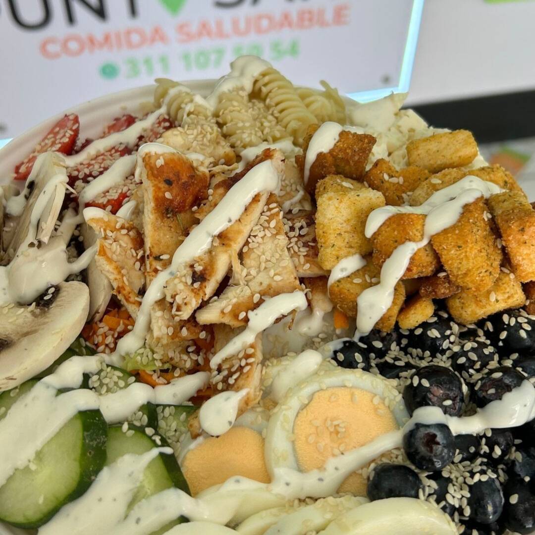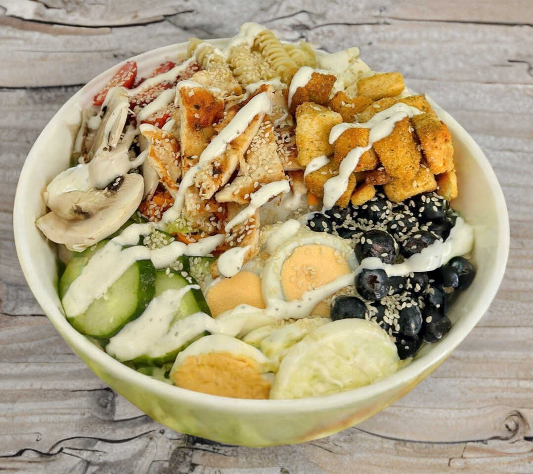 Ensalada de la casa, con 4 proteínas, 150 g de pollo, 2 huevos, champiñón, 120 g de panela, pasta, fresas, arándanos, crutones, a base de lechuga, pepino, zanahoria, aderezo ranch y ajonjolí.