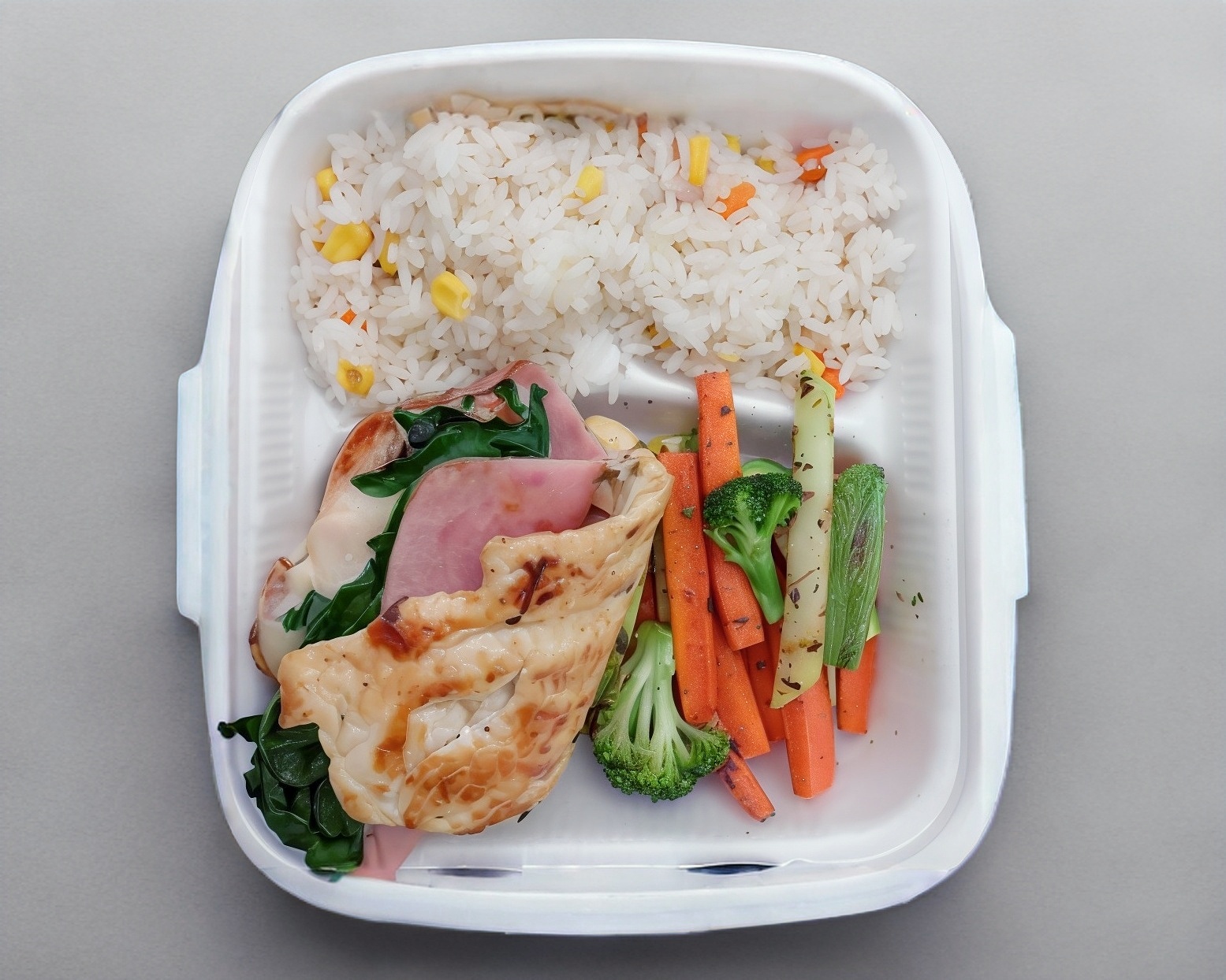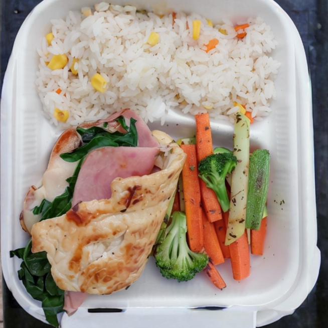 150 g De pechuga rellena de jamón de pavo, queso mozzarella, espinaca, acompañado de vegetales salteados, arroz, salsa martajada, tostadas salmas.