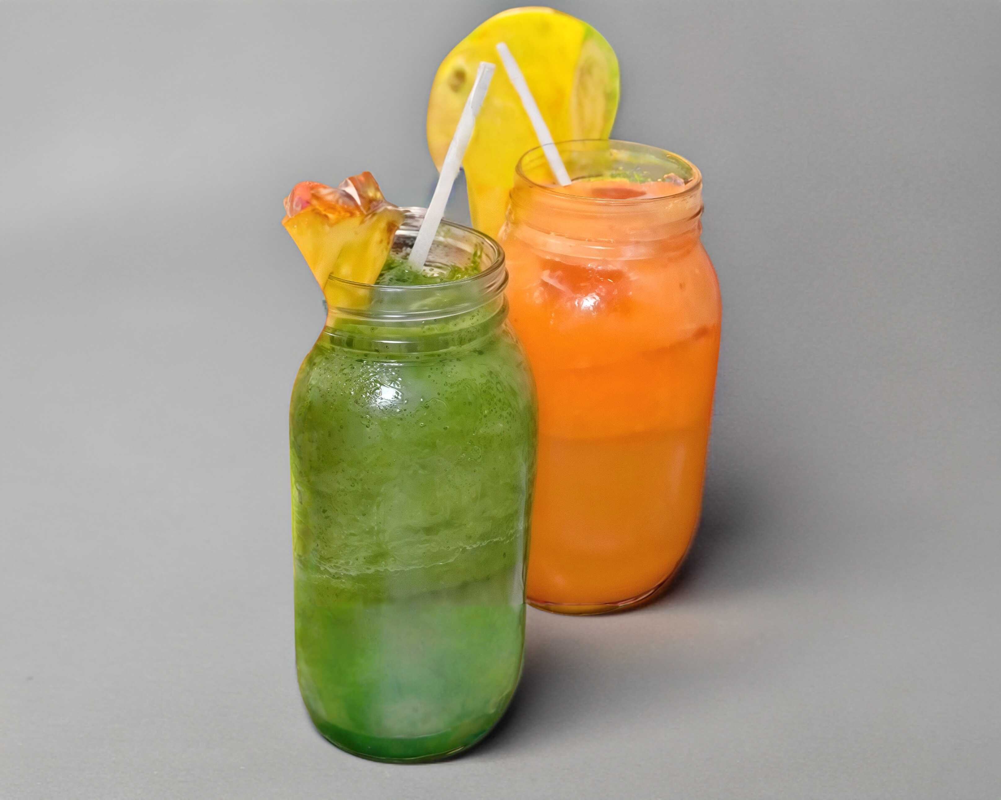 Jugo verde elaborado con piña, naranja, espinaca, perejil, apio, nopal, pepino, jengibre, agua.
