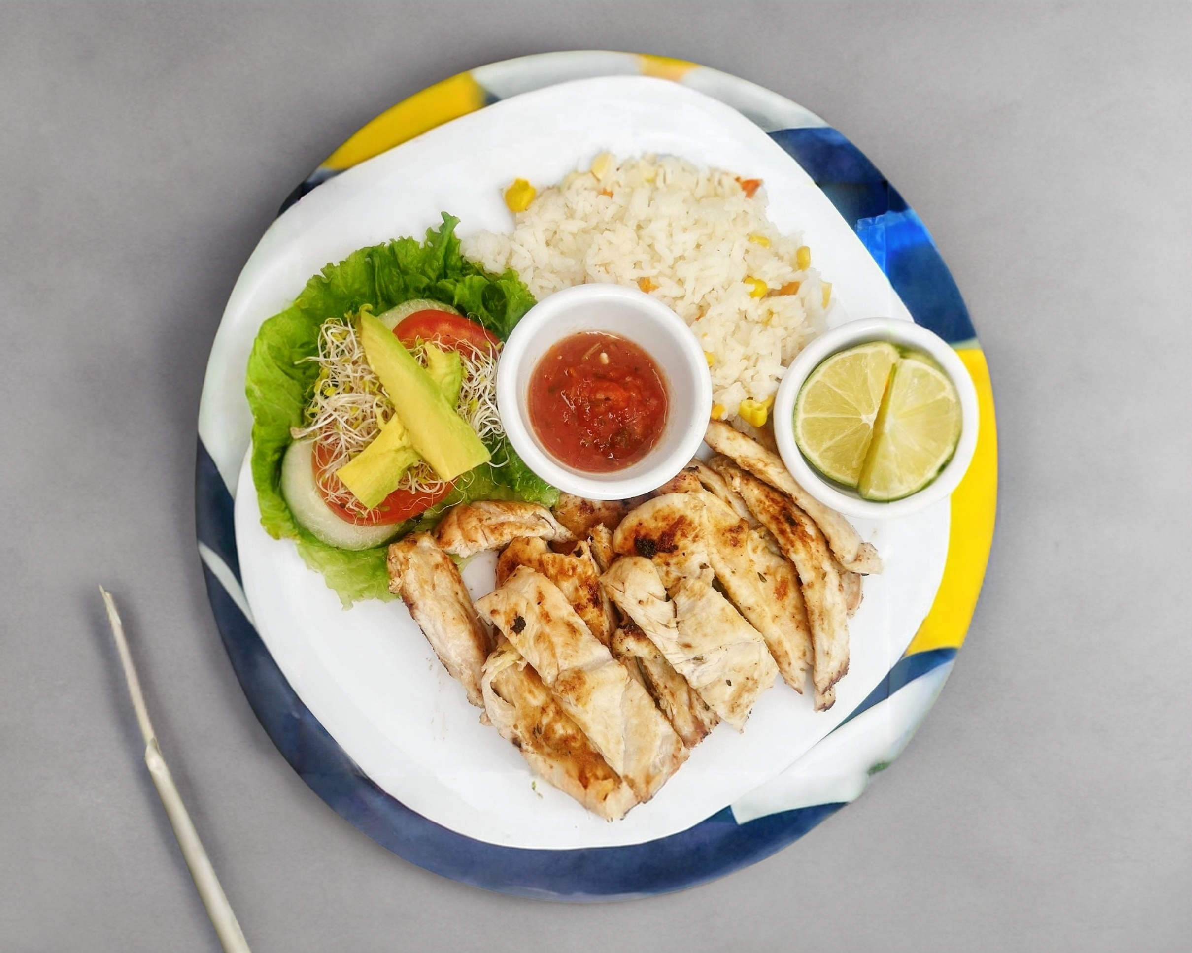 150 g De pechuga de pollo a la plancha, acompañada de vegetales salteados, arroz, salsa martaja y tostadas salmas.