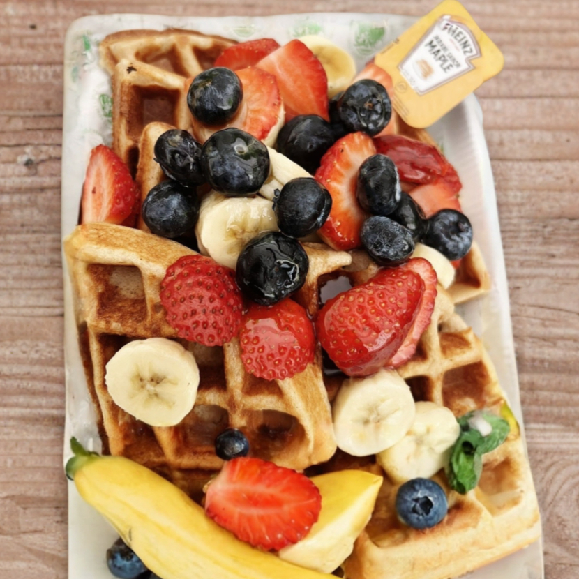 waffle elaborado con harina de avena, acompañado de fresa, plátano, bluberry y miel.
