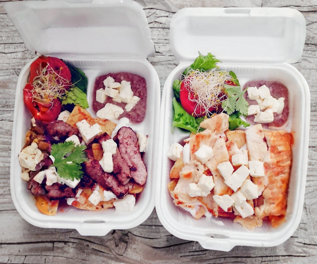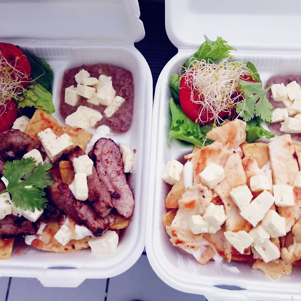 Tradicionales chilaquiles en salsa verde, con crema, panela, 120 g de arrachera a la plancha acompañado de ensalada y frijolitos.