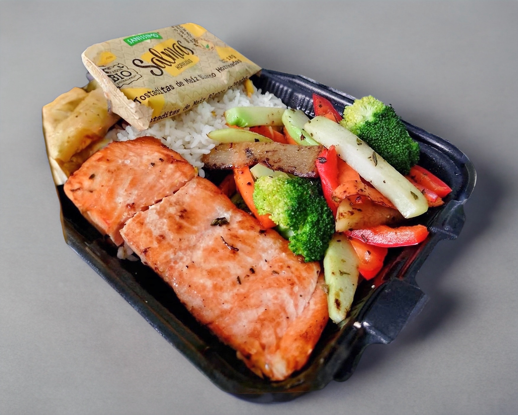 150 g De salmón a la plancha sazonado con especies, acompañado de vegetales salteados, arroz, tostadas salmas.