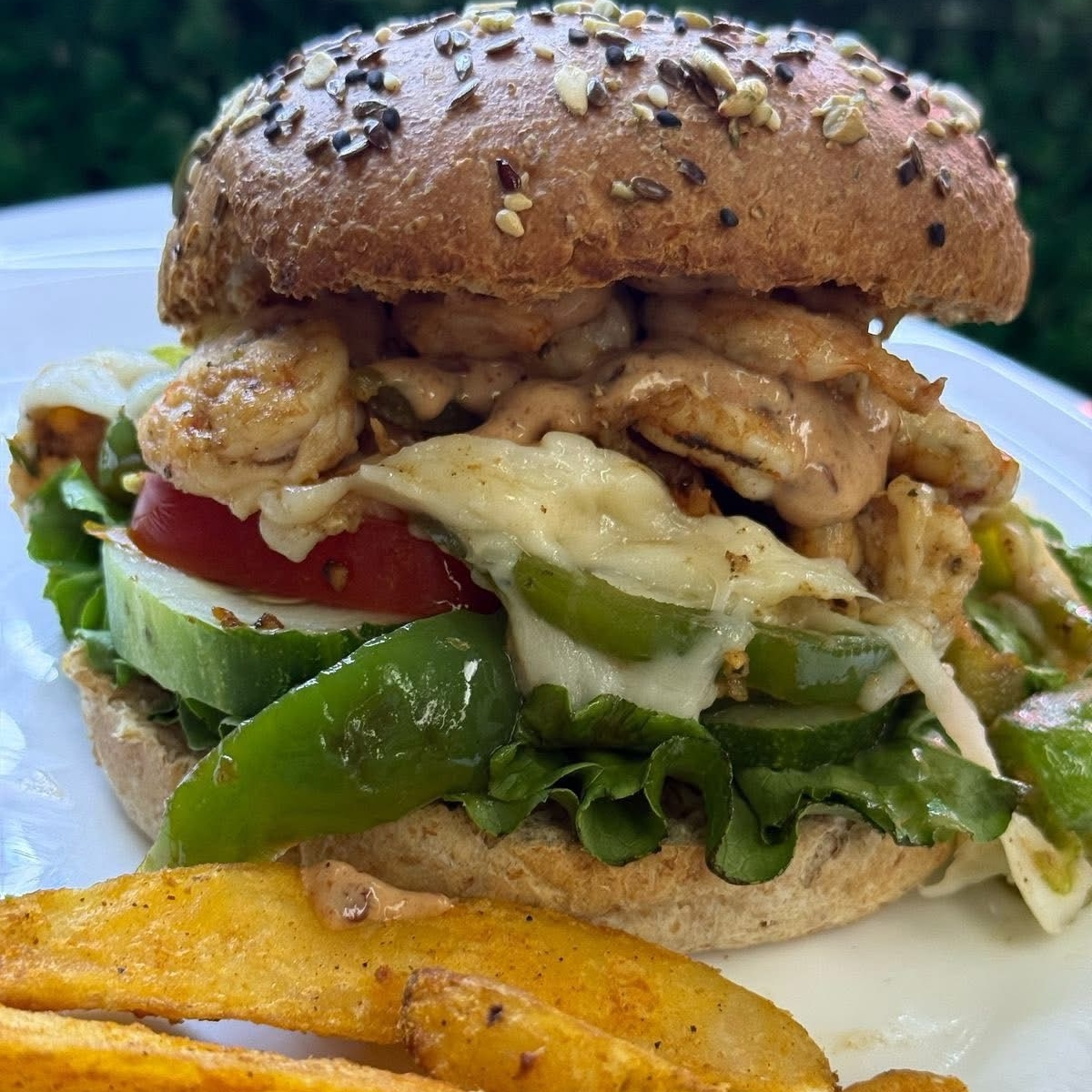 Hamburguesa elaborada con pan integral masa madre, 120gr de camaron, pimintos y cebolla salteada gratinada con queso mozzarella y aderezo chipotle acompañado de ensalada,papa gajo gajo aderezo chipotle
