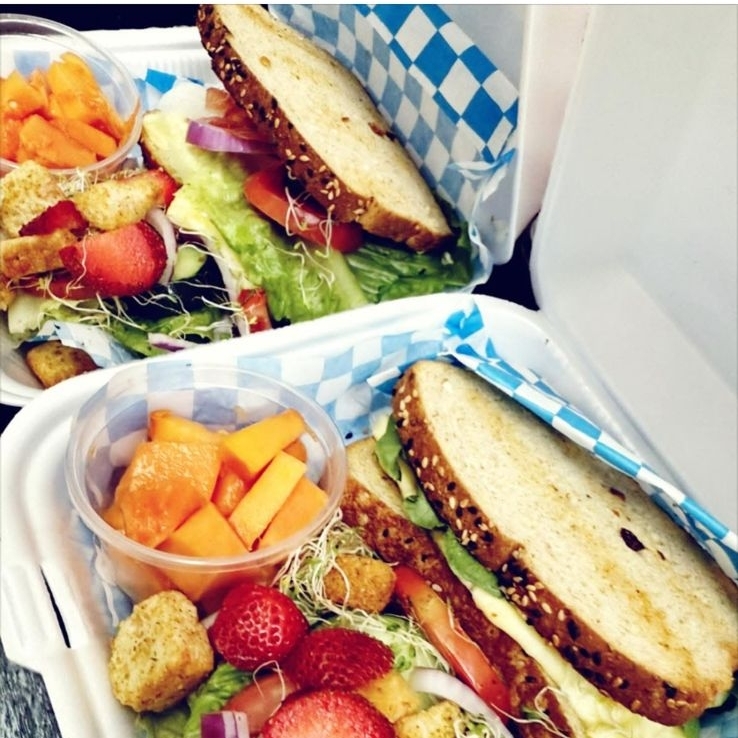 Sandwich elaborado con pan integral masa madre con panela fundida, 100gr de pechuga de pollo a la plancha. Lecuga, jitomate, pepino, cebolla, germen, acompañado de ensalada, fruta de temporada y aderezo chipotle
