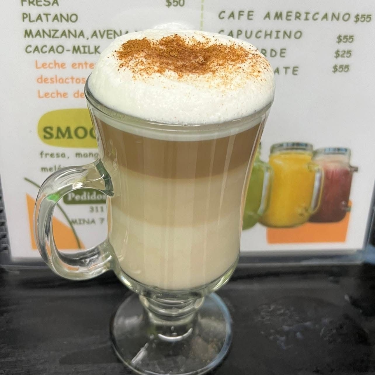 Bebida caliente a base de café, leche vaporizaday una capa de espuma de leche