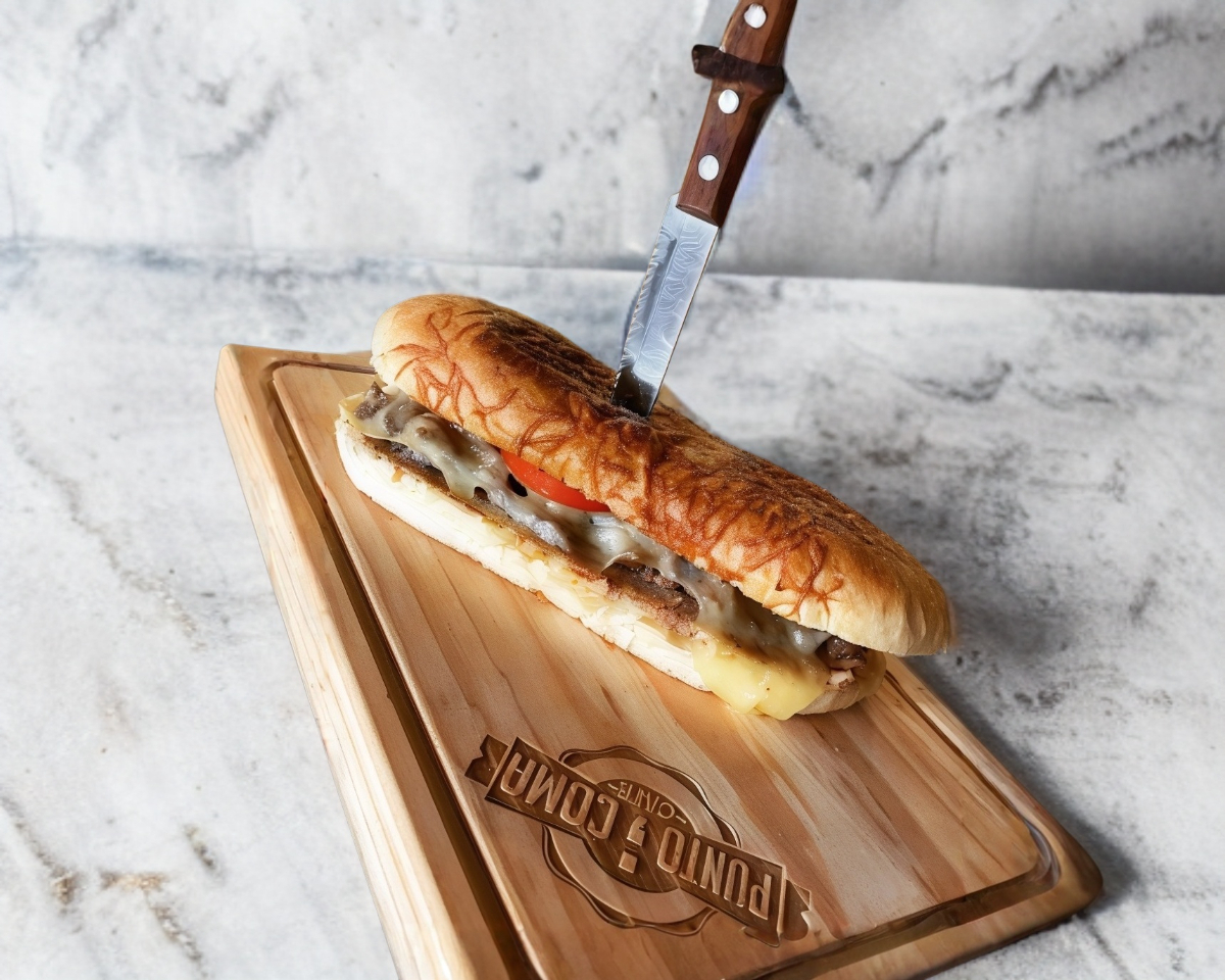 Un bolillo con frijolitos, arrachera y queso gratinado.