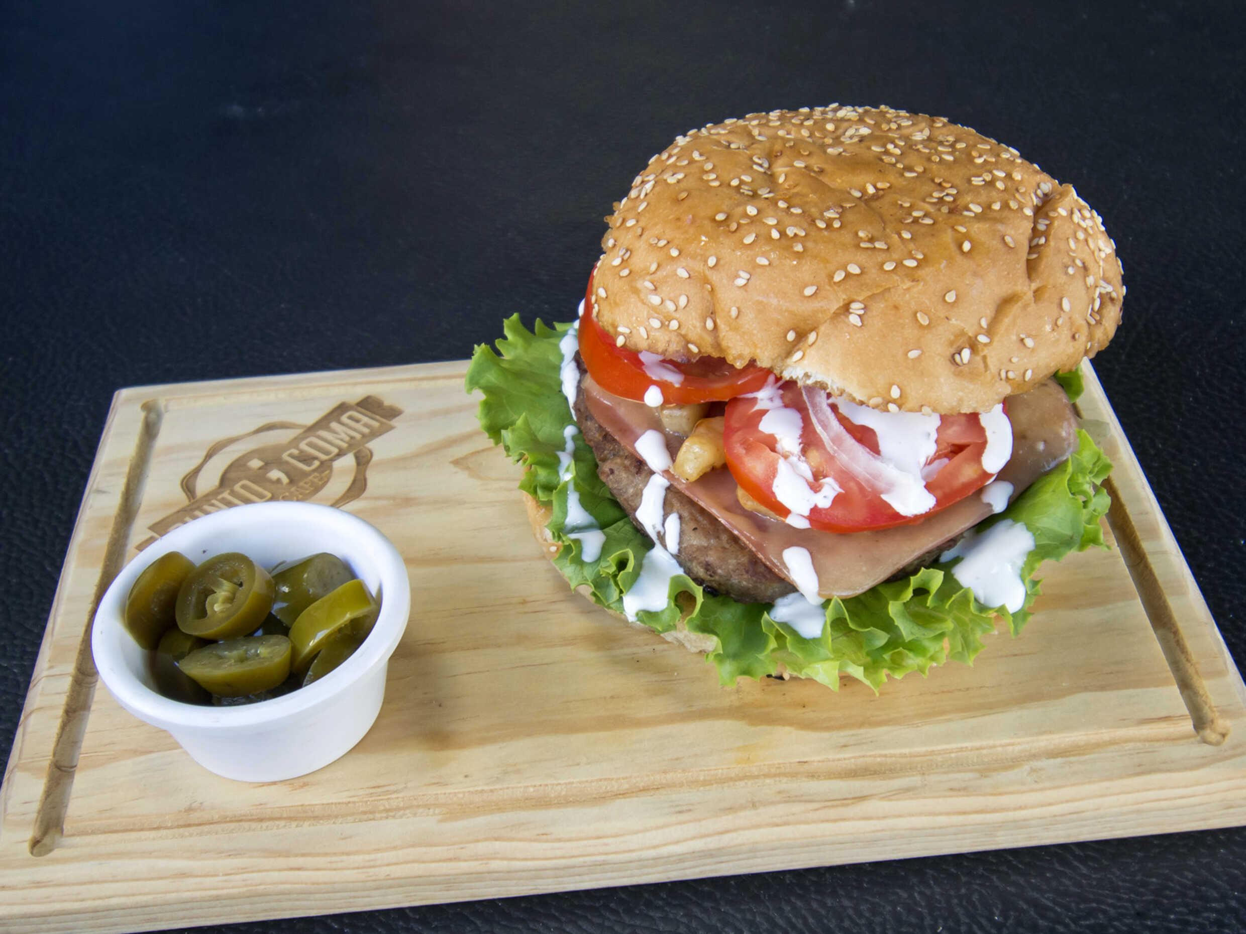 Deliciosa hamburguesa de carne de pollo elaborada en casa, con lechuga, jitomate, pepinillo y cebolla.