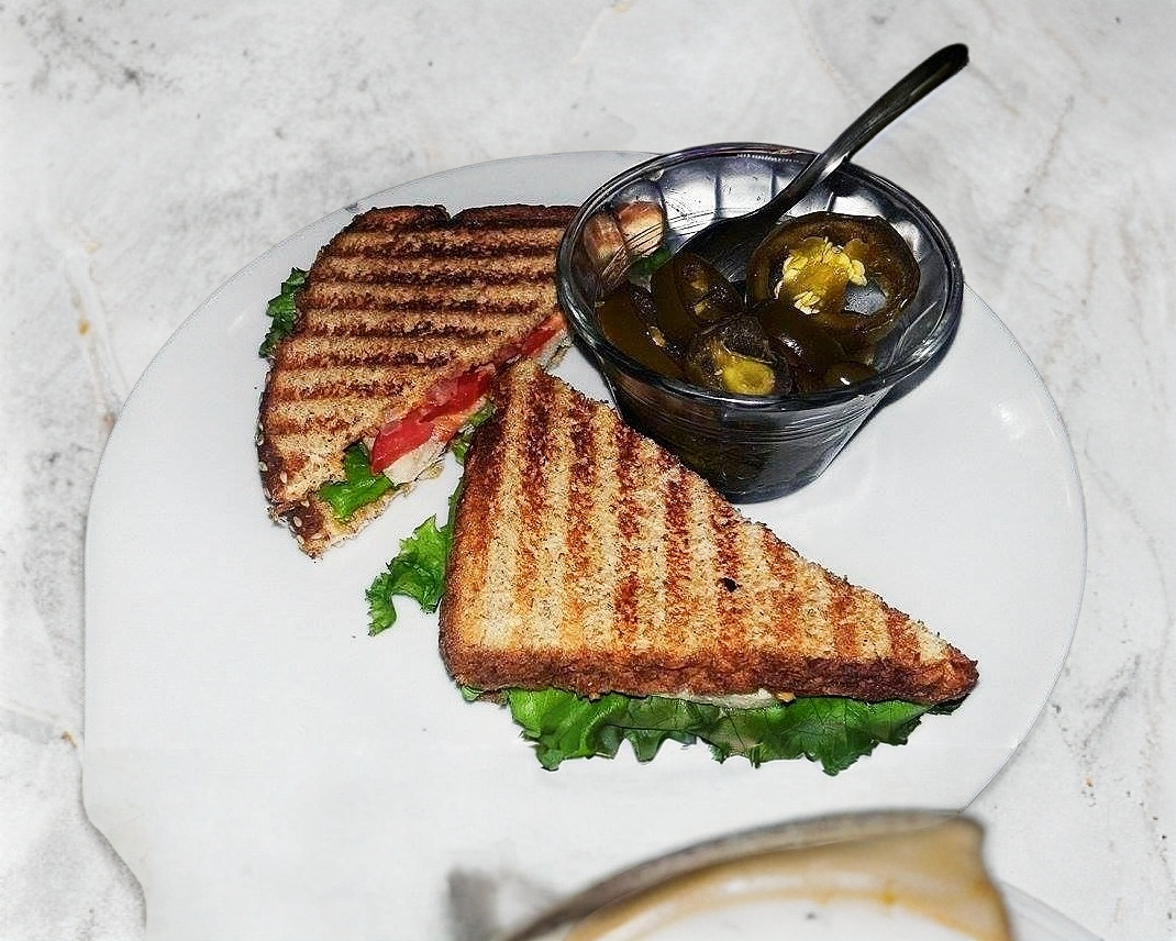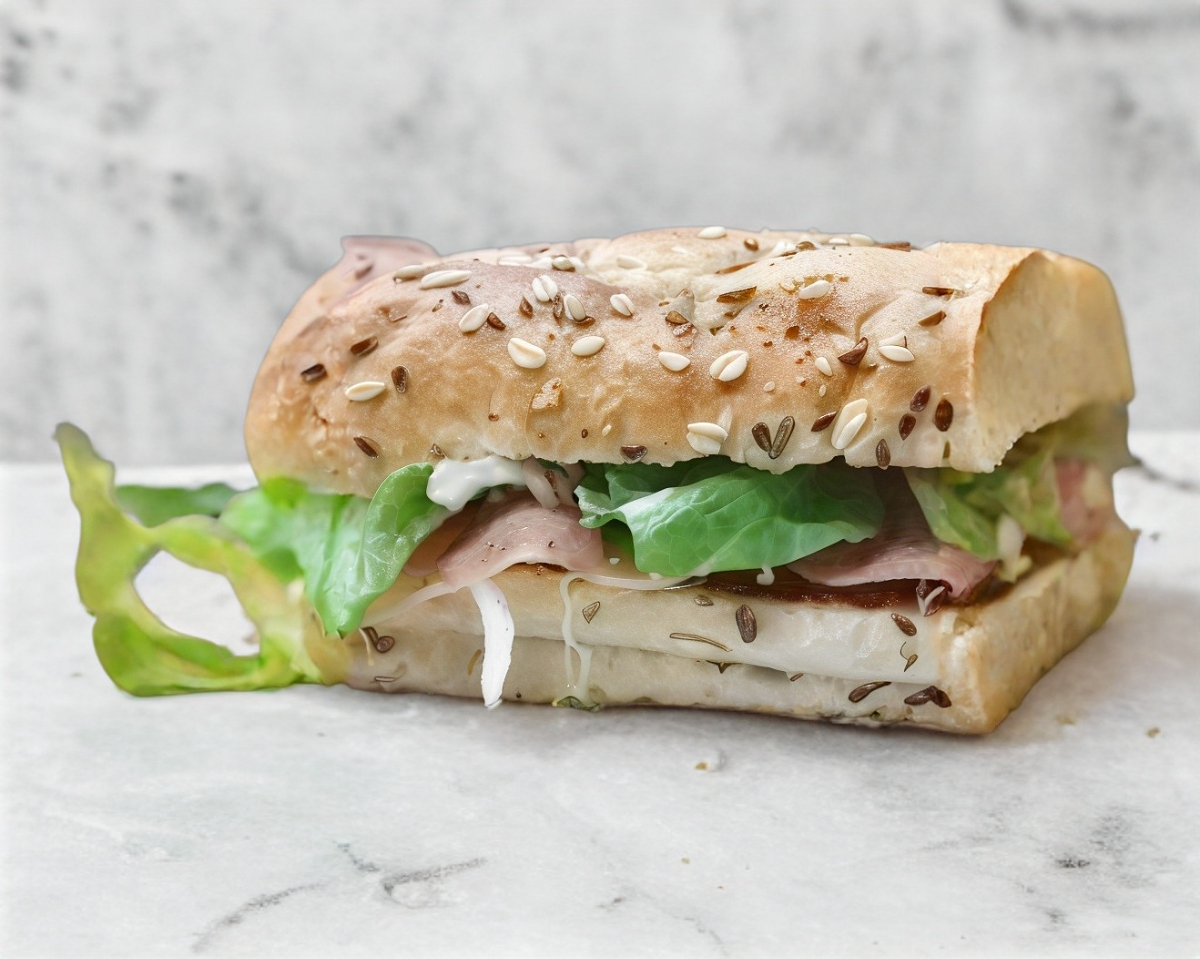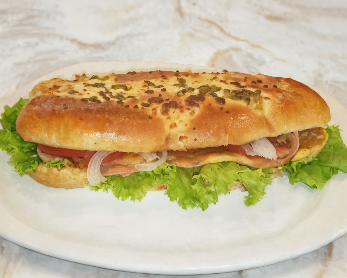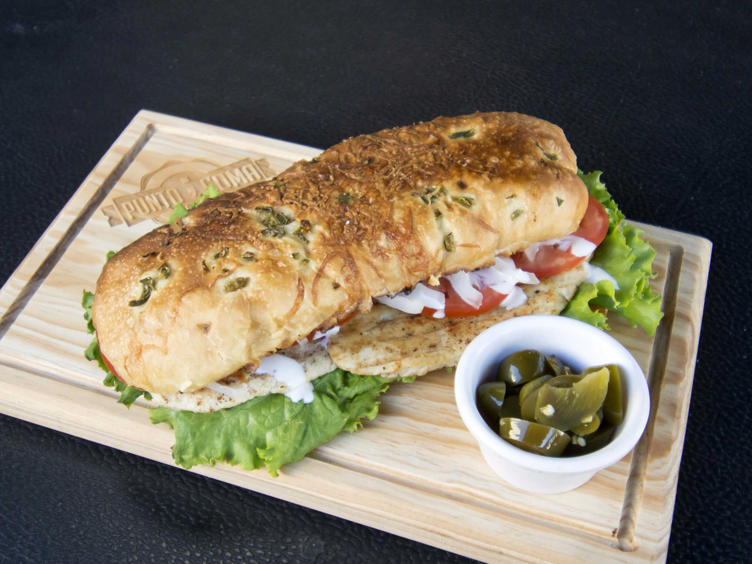 Delicioso Baguette de pollo grill con lechuga italiana, jitomate y cebolla