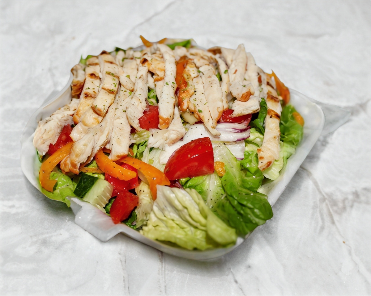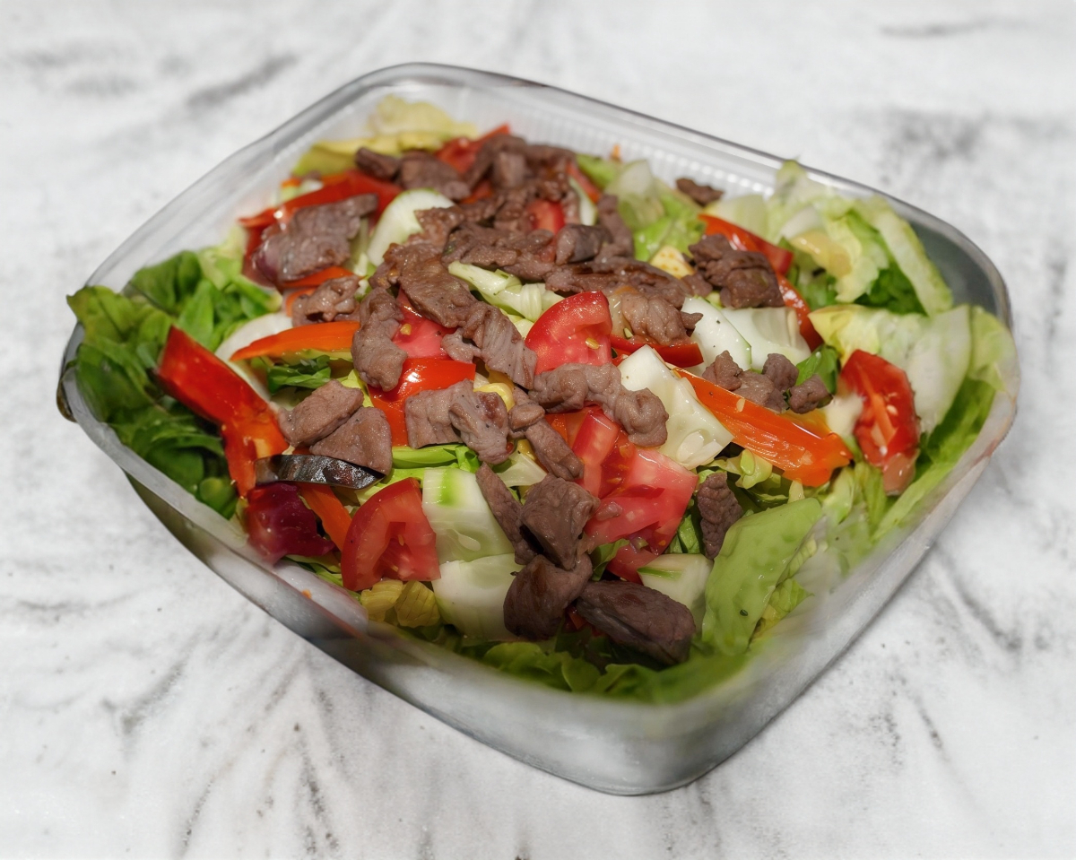 Deliciosa en ensalada con arrachera de res(180 grs.) . Mixto de lechugas, jitomate, cebolla y cebolla.