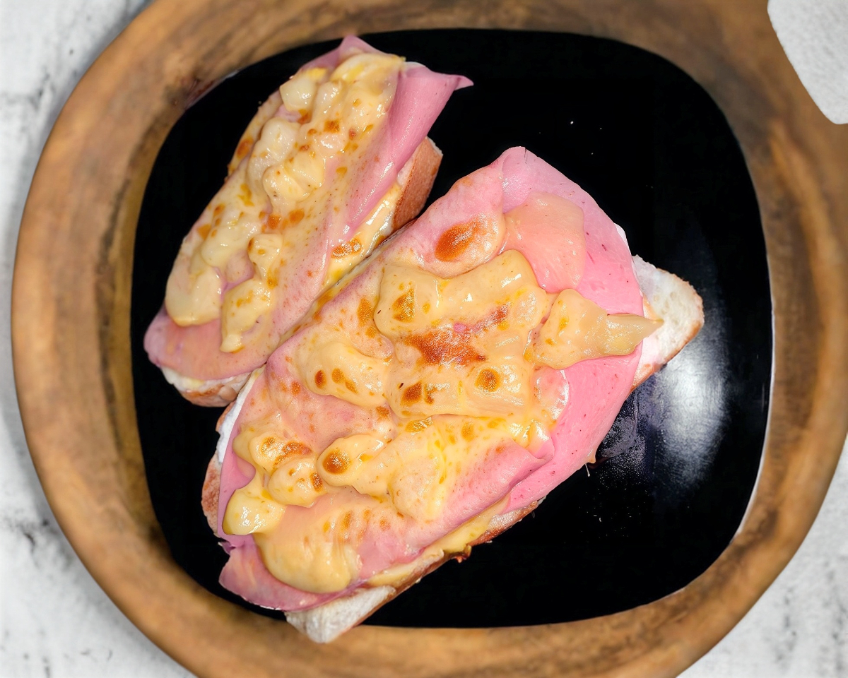 Un bolillo a la mitad con jamón y queso manchego gratinado.