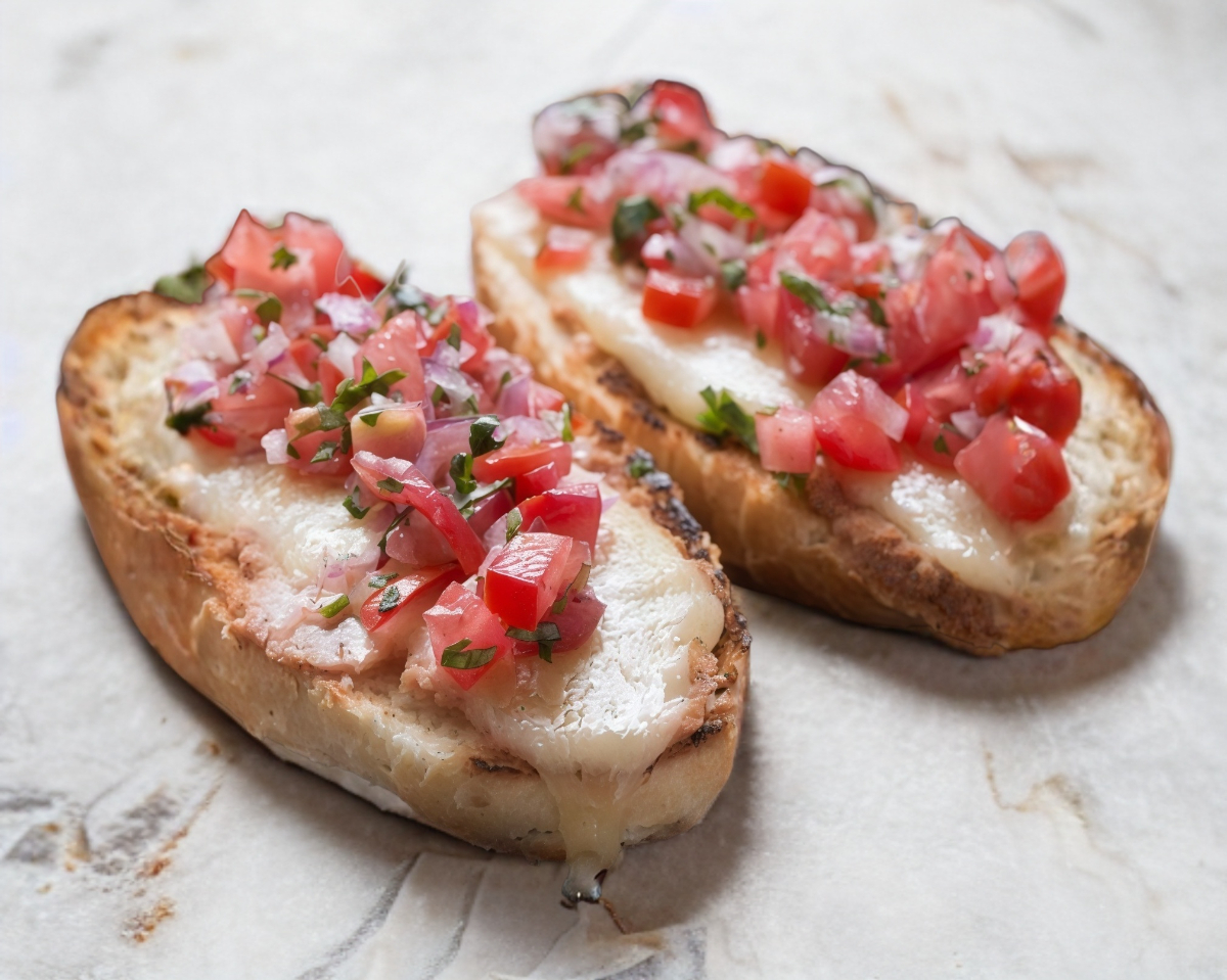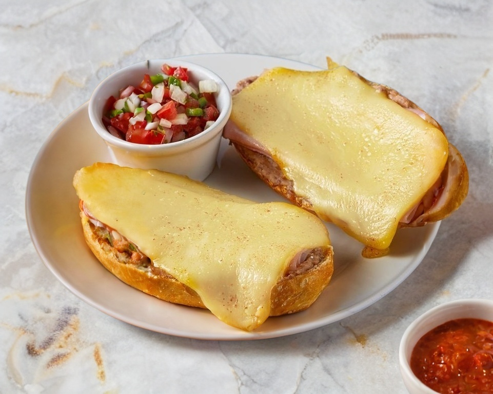 Un bolillo con frijoles y queso gratinado con salsa mexicana.