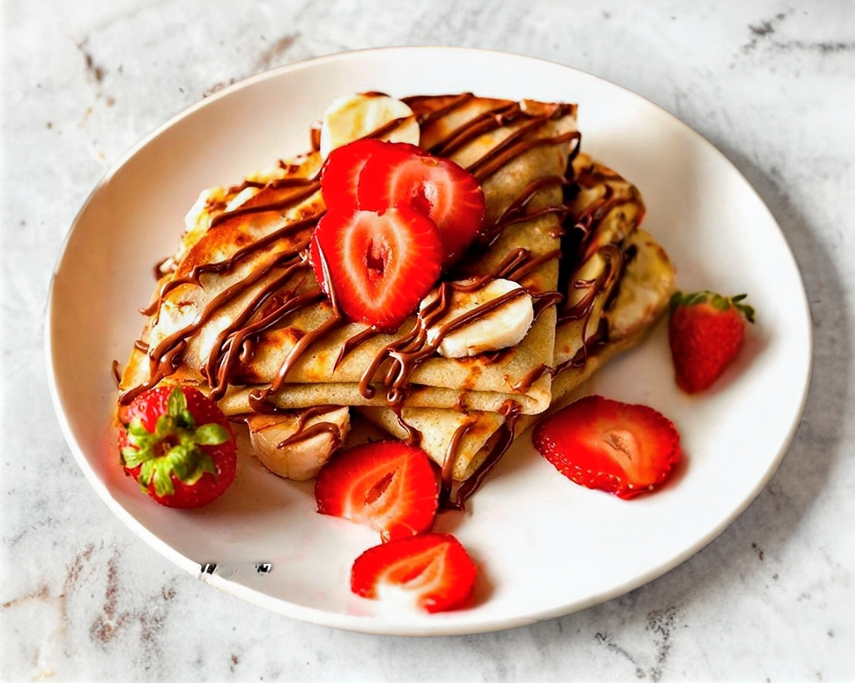 Crepa con fresa, durazno y plátano, bañada con Lechera.