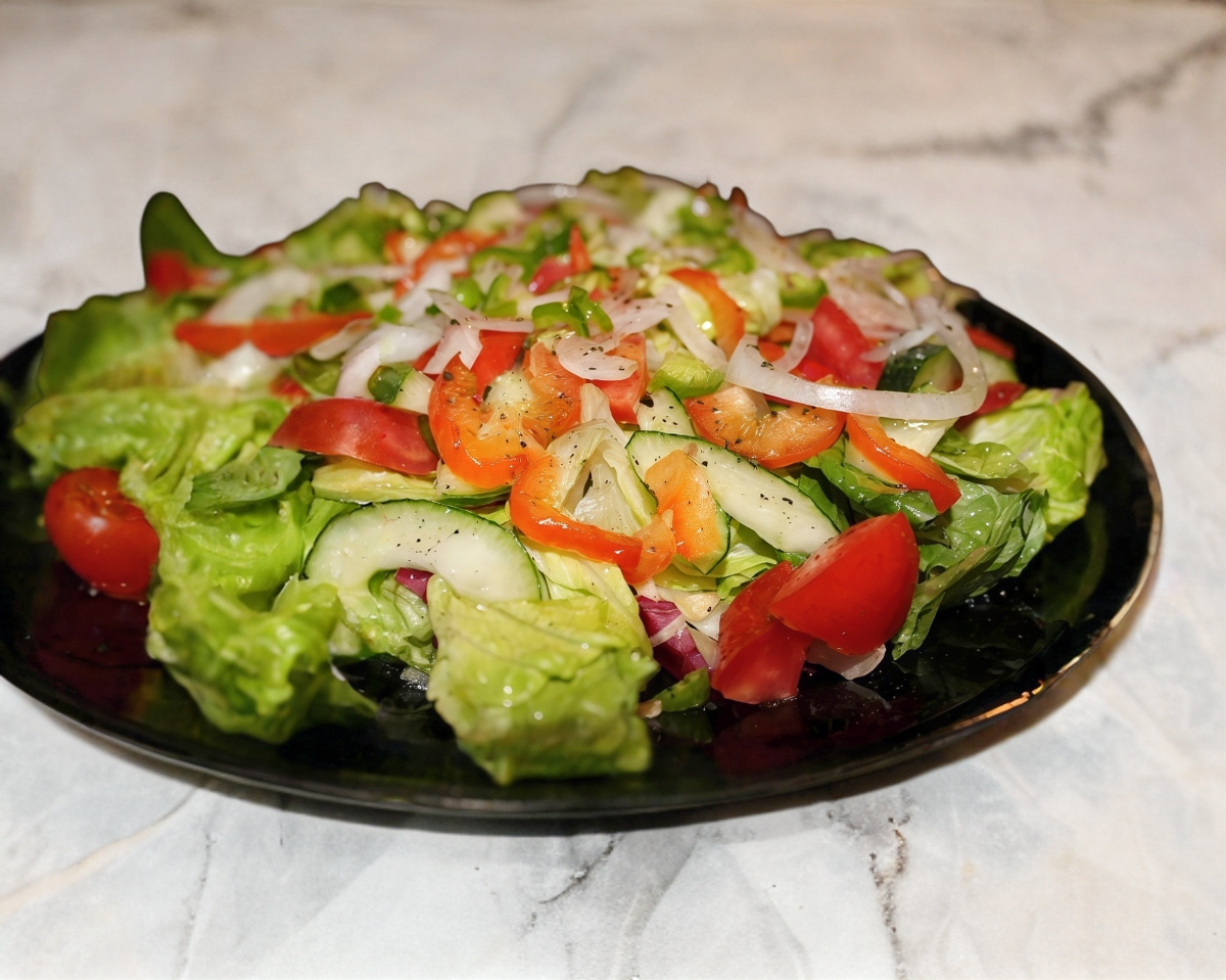 Mixto de lechugas, jitomate, pepino, manzana verde, pimiento morrón, cebolla y aderezo a tu elección.