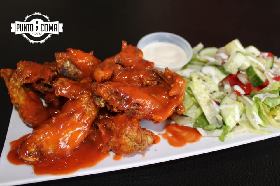 Alitas de pollo bañadas en salsa búfalo, acompañadas de ensalada y aderezo ranch.