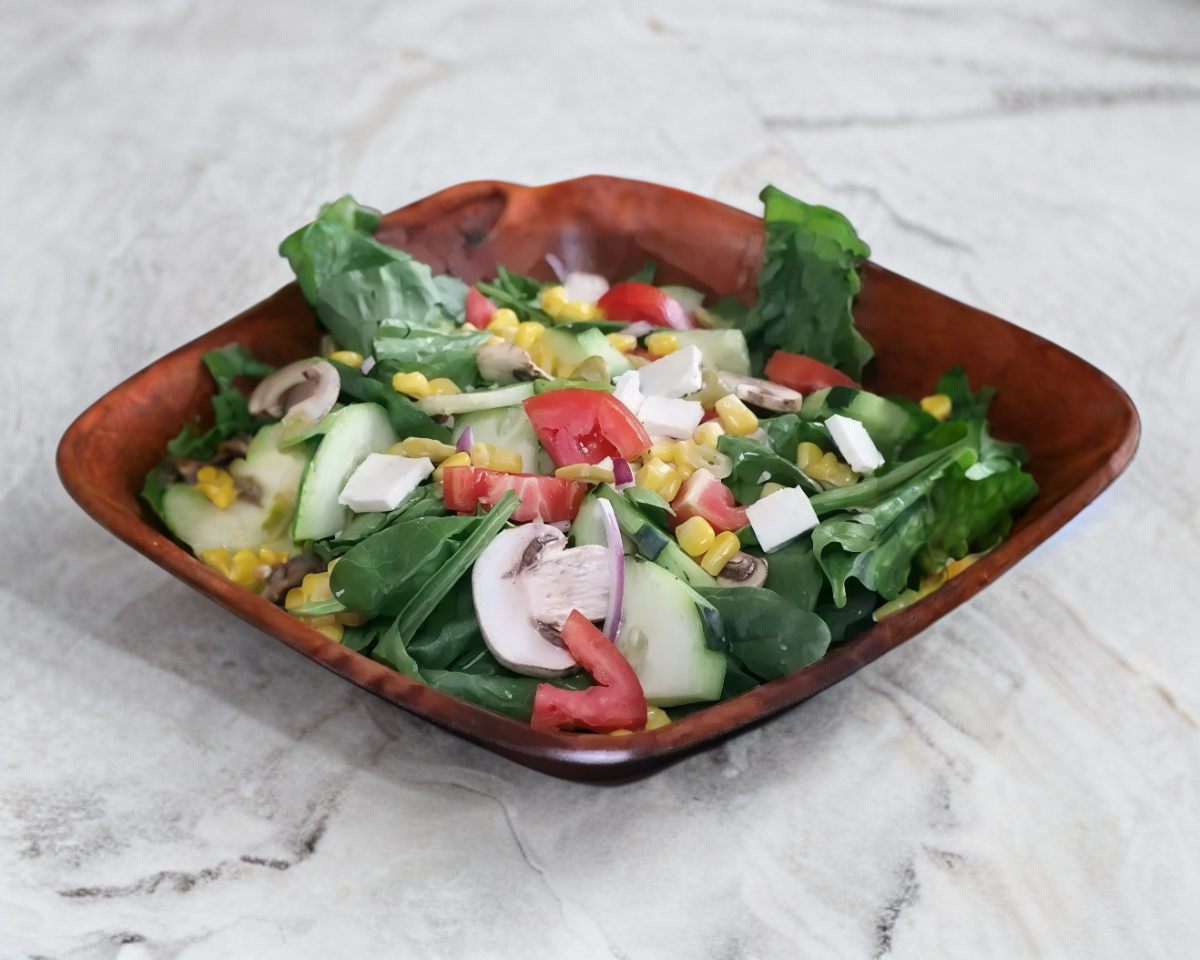 Mixto de lechugas, jitomate, pepino, pimiento morrón, manzana verde, champión natural, elote y cebolla, acompañado de aderezo a elección.