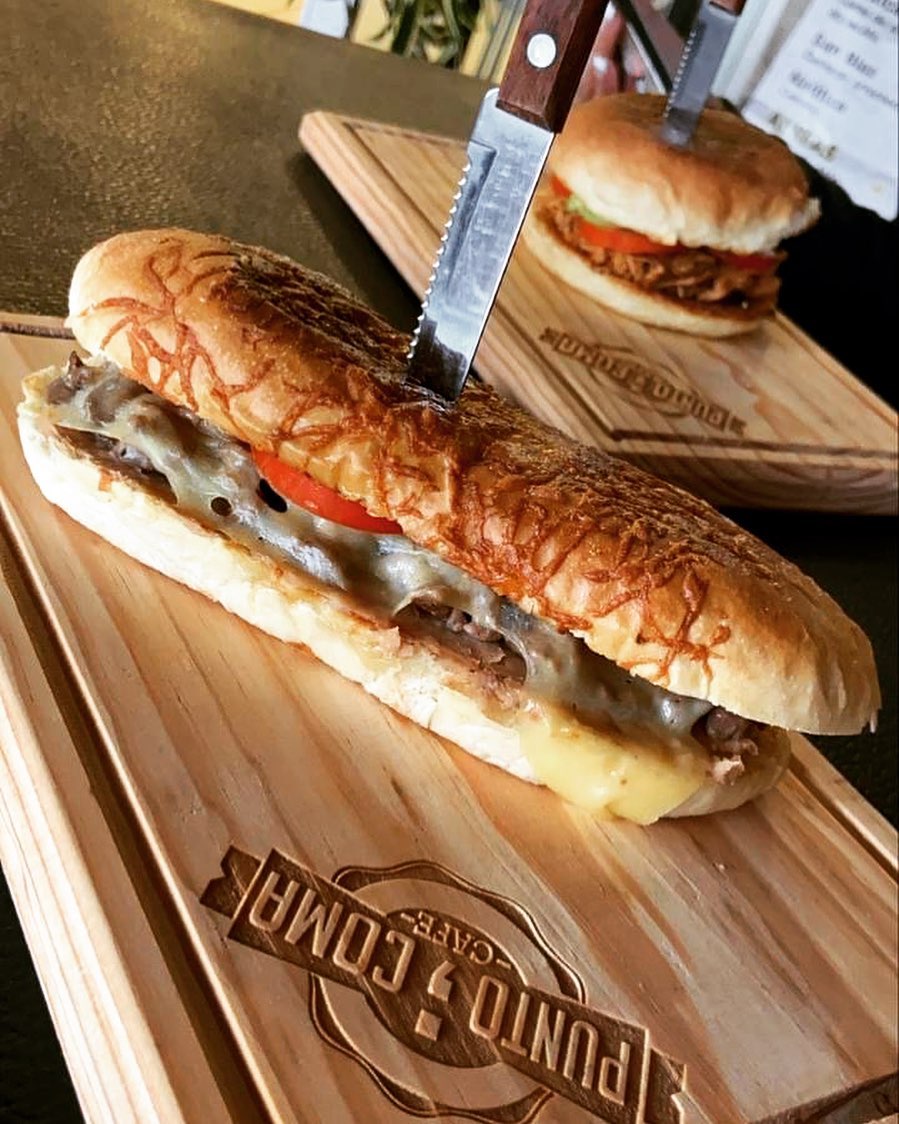 Delicioso baguette relleno de una mezcla de camarones salteados con pimiento morrón y cebolla, gratinados con queso manchego.
