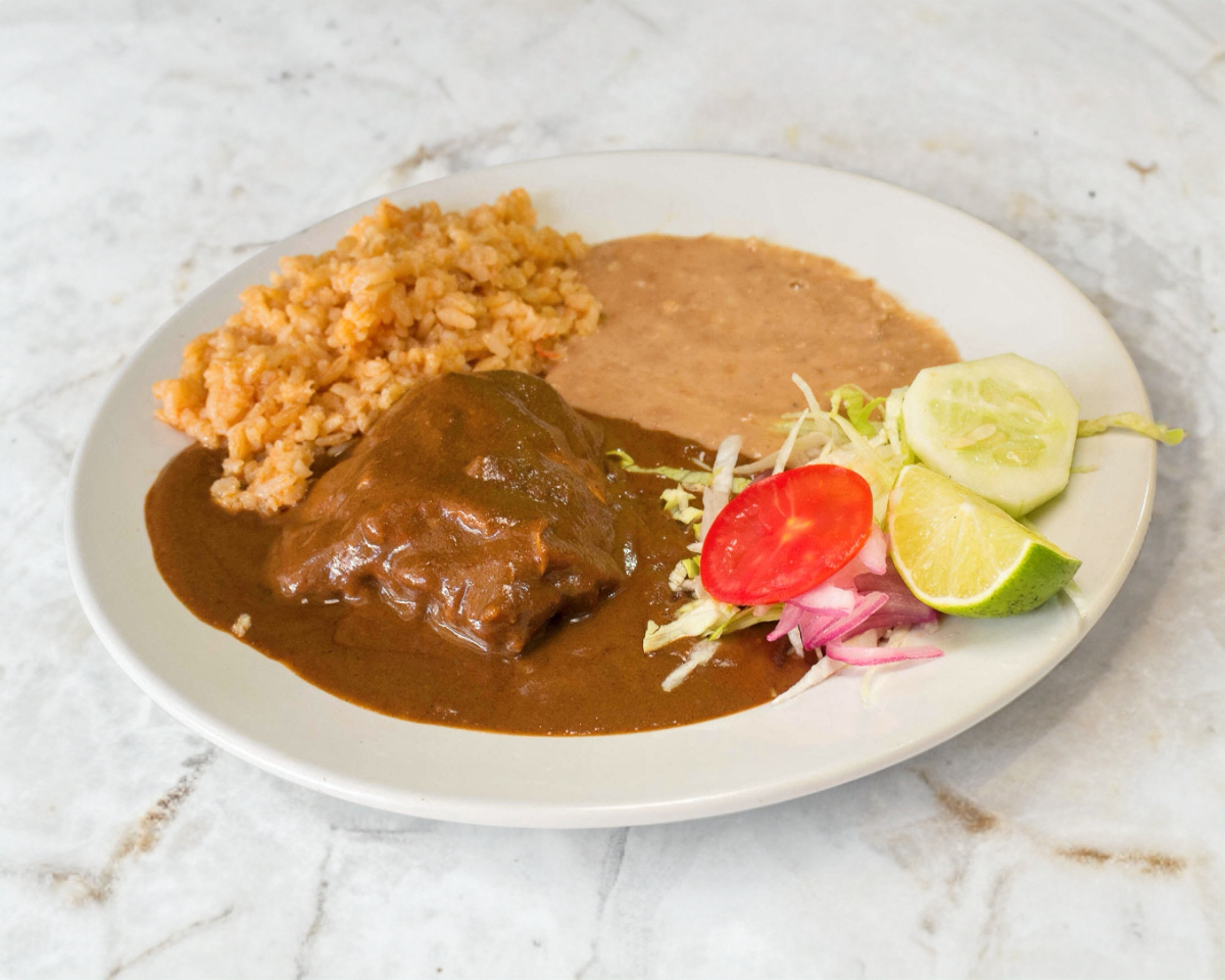 Pollo en mole dulce preparado con chocolate acompañado con arroz, frijoles, ensalada y tortillas hechas a mano