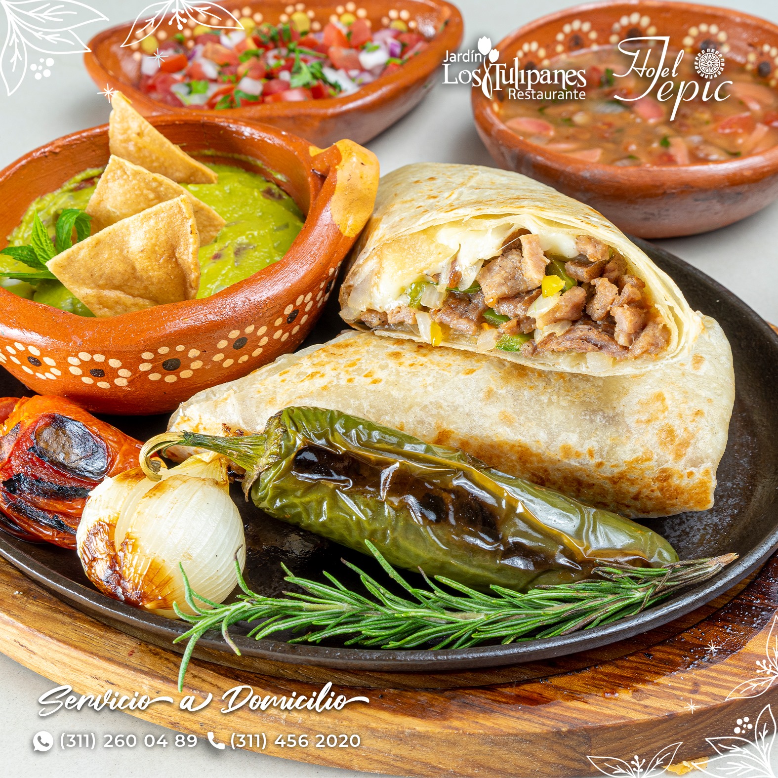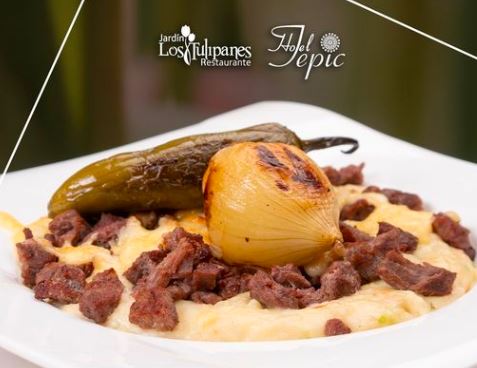 Relleno de machaca 60 gramos a la mexicana y en crema de chipotle. Acompañado de papa de la casa.