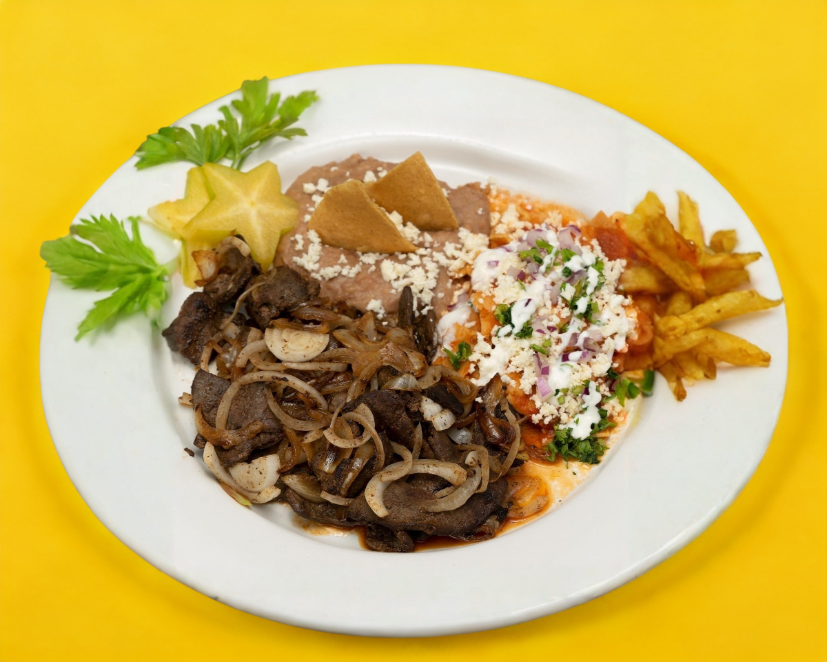 Deliciosa carne, 150 gramos, salsa picosa acompañado de frijoles y chilaquiles.