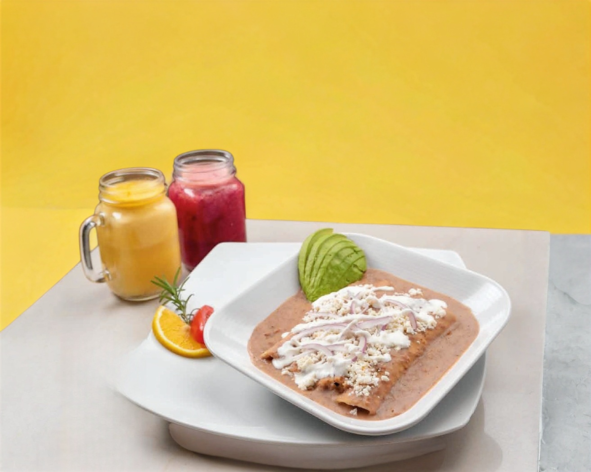 4 piezas, enfrijoladas rellenas de pollo, bañadas en salsa de frijol y aguacate.