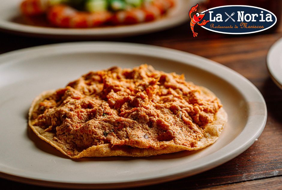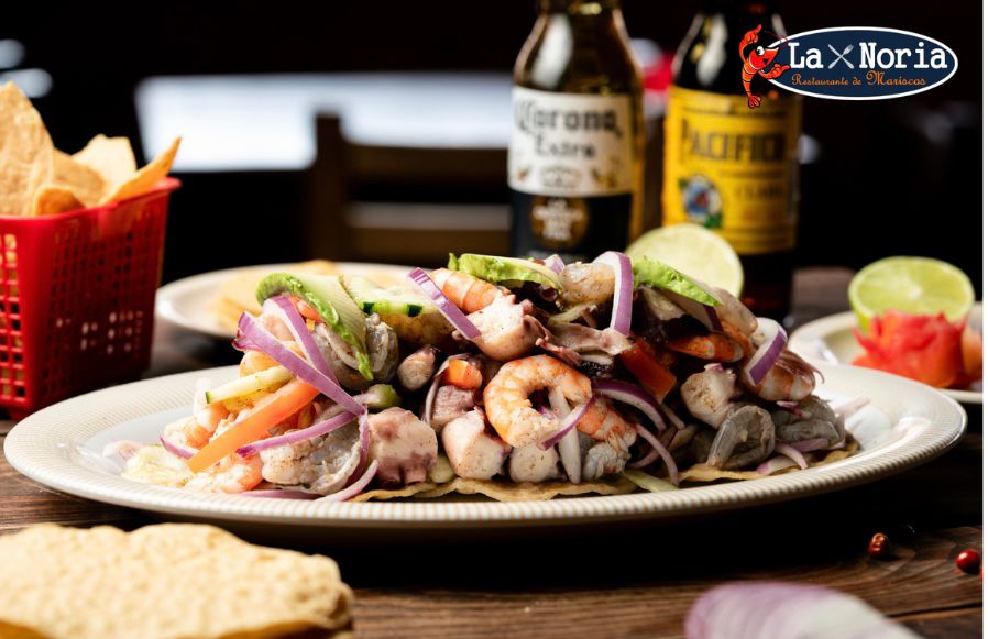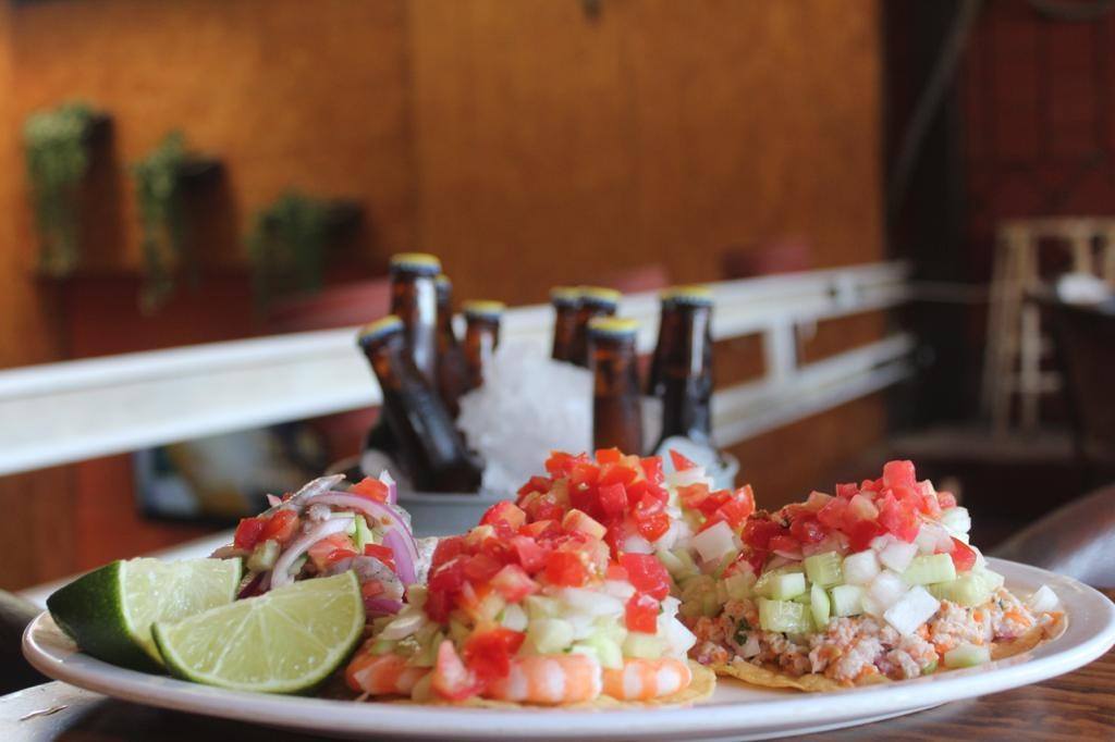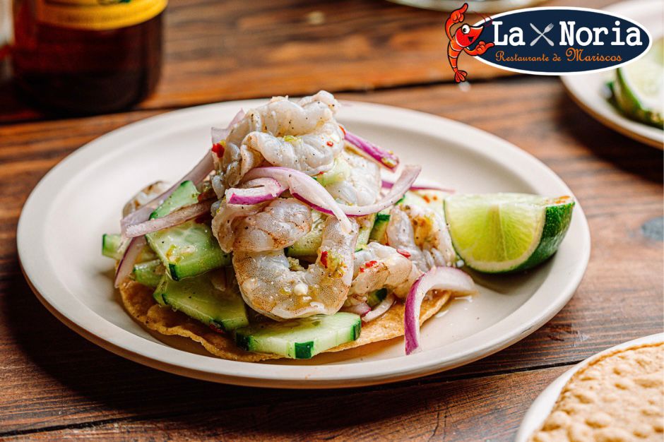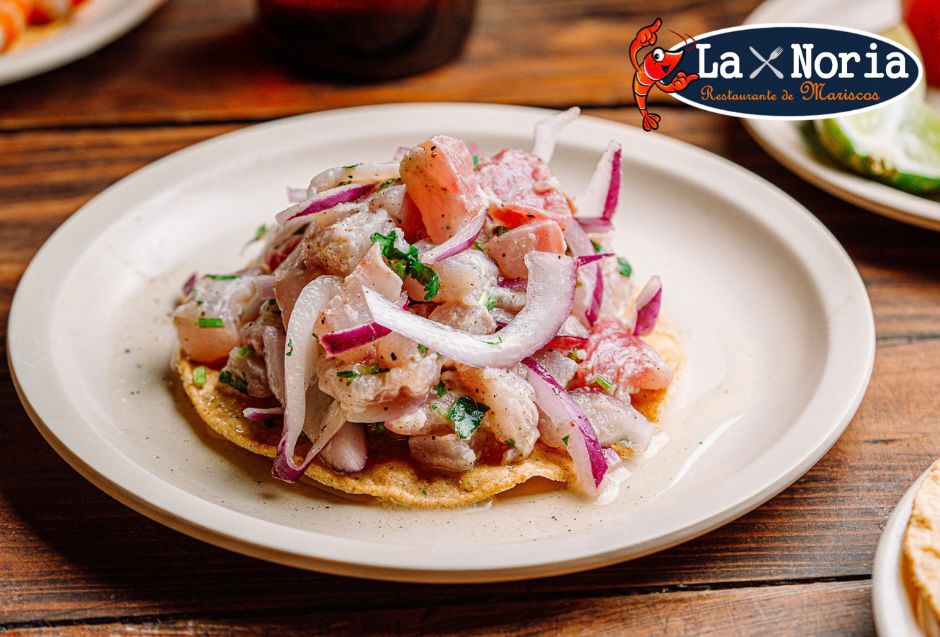 Crujiente tostada de maíz cubierta con ceviche de pescado, camarón cocido y una mezcla fresca de verdura. Una combinación generosa y bien balanceada que ofrece frescura, textura y auténtico sabor del mar en cada bocado.
