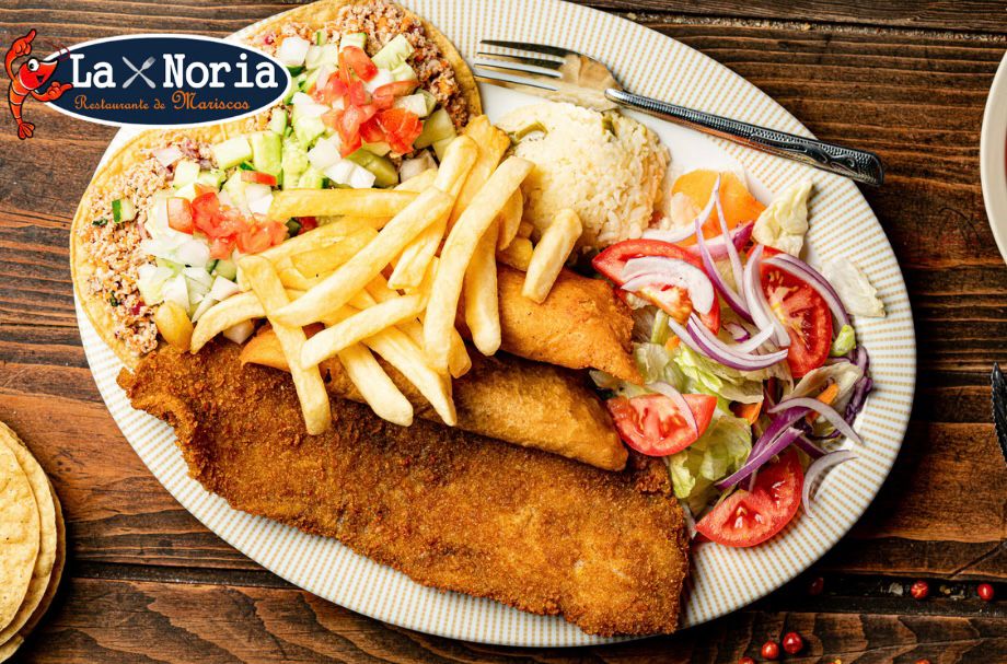 🐟Medio kilo de filete de pescado empanizado, crujiente por fuera y suave por dentro, servido con una fresca ensalada de lechuga, papas a la francesa doradas, plátano frito y una porción de arroz blanco. Un platillo abundante y balanceado, ideal para disfrutar lo mejor del mar acompañado de guarniciones clásicas.