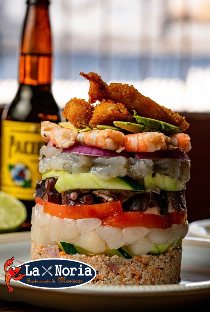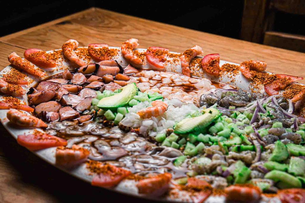 Ceviche de pescado, camarón cocido, aguachile, callo de almeja, pulpo y camarón empanizado.