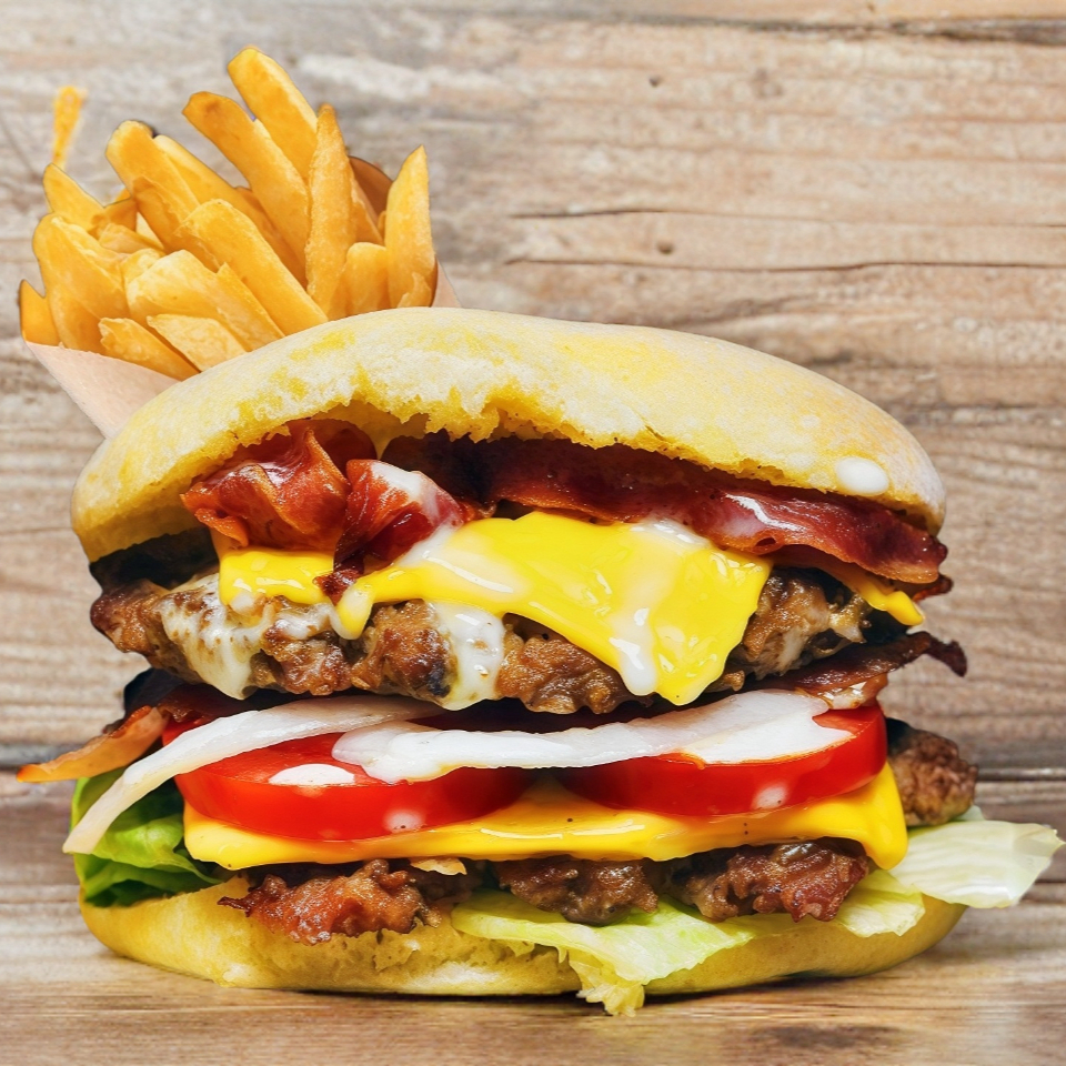 A la plancha, dos porciones de carne 100% res y tocino, doble queso genuino amarillo, lechuga, jitomate, cebolla, aderezo ruf, todo montado en telera horneada artesanalmente del día. Incluye papas a la francesa