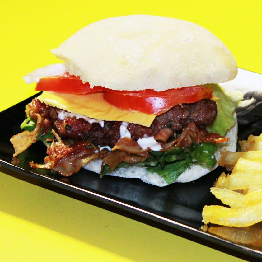 A la plancha carne 100% res, tocino, queso cheddar, lechuga, jitomate, cebolla, aderezo ruf, todo montado en telera horneada artesanalmente del día, con papas a la francesa