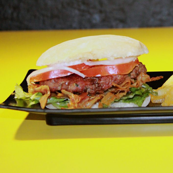 A la plancha carne 100% res, tocino, lechuga, jitomate, cebolla, queso amarillo, aderezo ruf, todo montado en telera horneada artesanalmente del día.