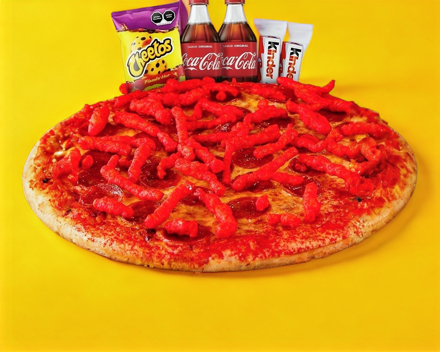 Combo Flamin Hot para 3–4 personas: incluye 1 pizza de pepperoni de 8 rebanadas, 2 bebidas de 600 ml a elección, 2 chocolates Kinder y 1 Cheetos Flamin Hot.