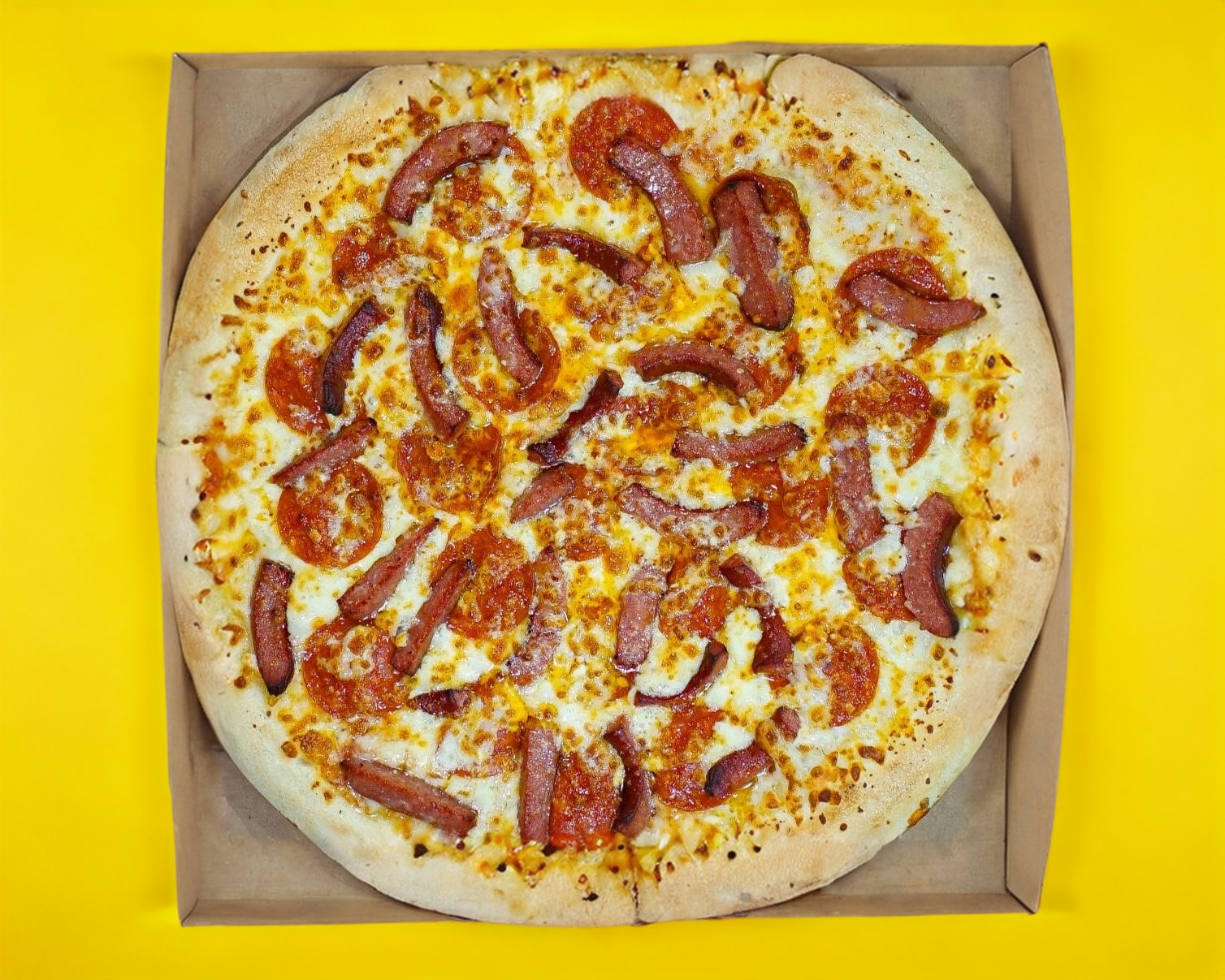 Pizza Tres Carnes (8 rebanadas): La exquisita por excelencia, ideal para 3–4 personas. Preparada con pepperoni, salchicha italiana y trocitos de tocino.