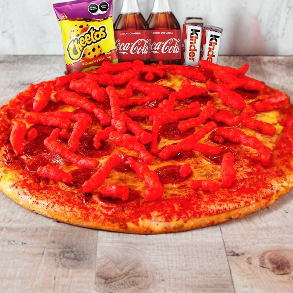 Pizza de pepperoni, 2 bebidas de 600 ml, 2 chocolates Kinder, 1 cheetos Flaming Hot.
