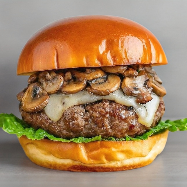 Hamburguesa de 150g de carne de res, queso blanco, champiñones, aderezada con nuestro dip de la casa, cebolla caramelizada, jitomate, cebolla cruda y lechuga fresca en pan Brioche.