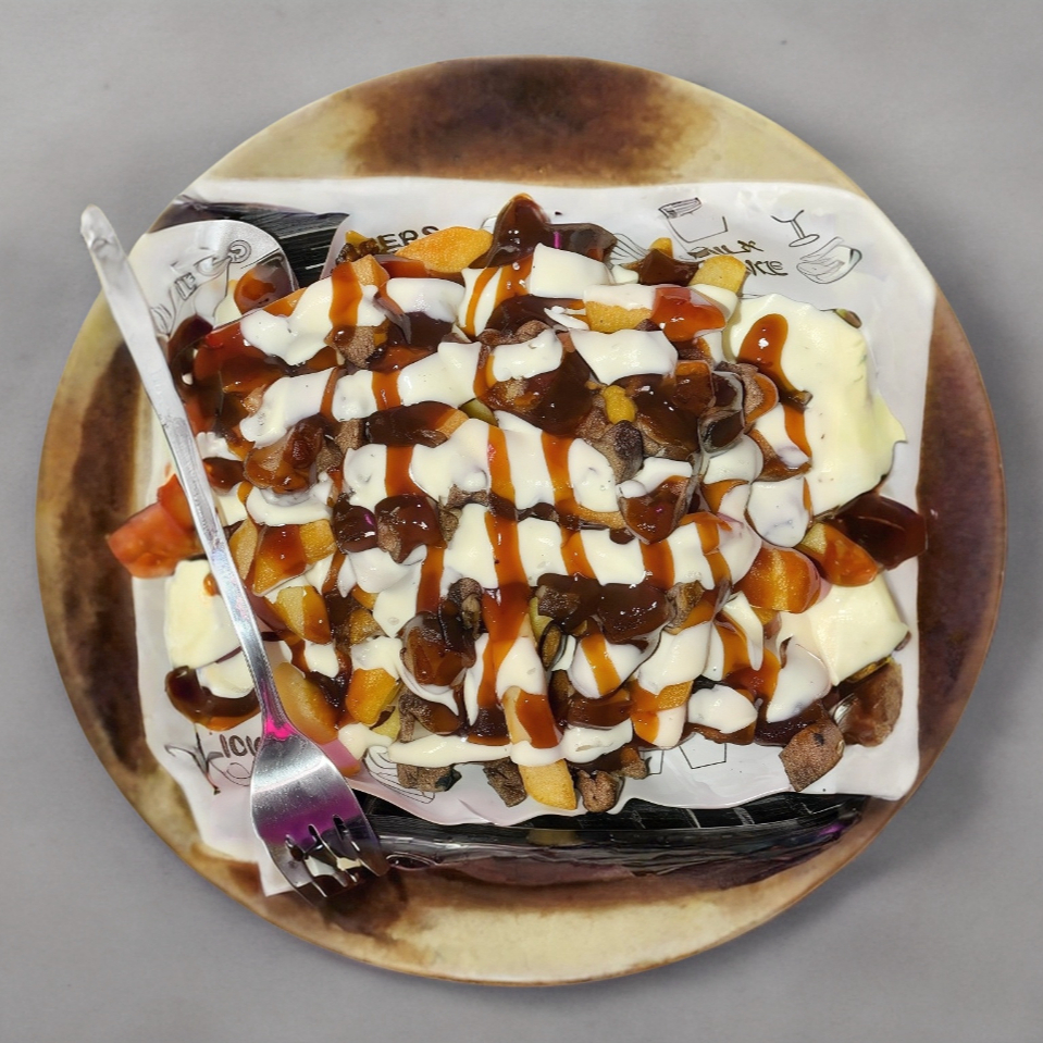 250g de papas a la francesa acompañadas de 100g de Carne de arrachera en trocitos. (Incluye 2 salsas ó 2 aderezos ó 1 salsa y 1 aderezo)