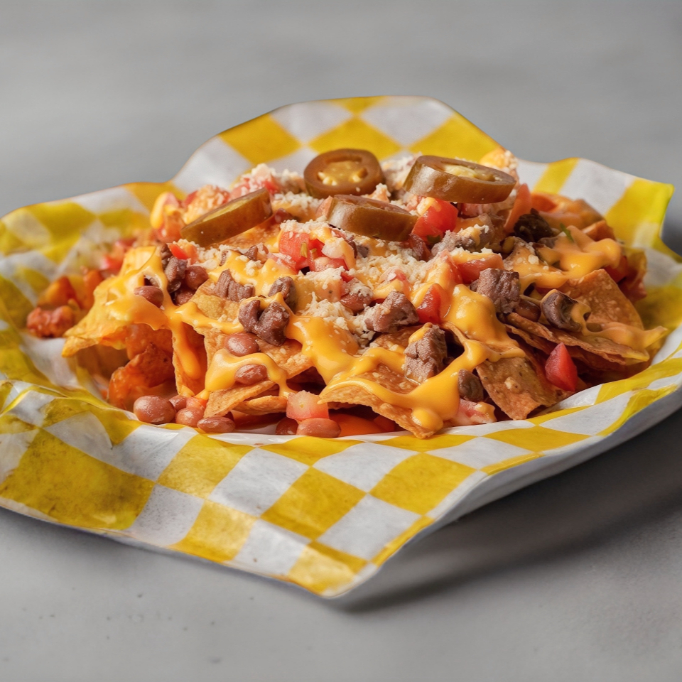 95 gramos de totopos bañados con frijoles, queso amarillo, acompañados de 100 gramos de arrachera, 75 gramos de chorizo y chiles jalapeños