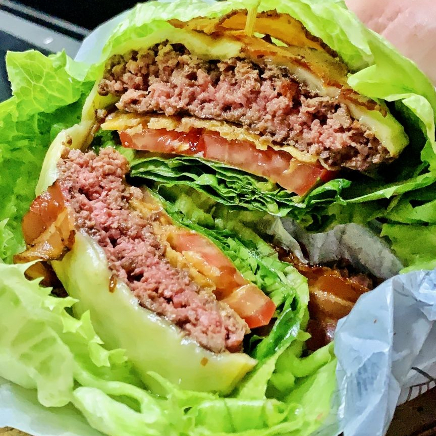 Hamburguesa de 150g de carne de res, queso, en vuelta de lechuga fresca supliendo el pan. Aderezada con nuestro dip de la casa, cebolla caramelizada, jitomate, cebolla cruda.