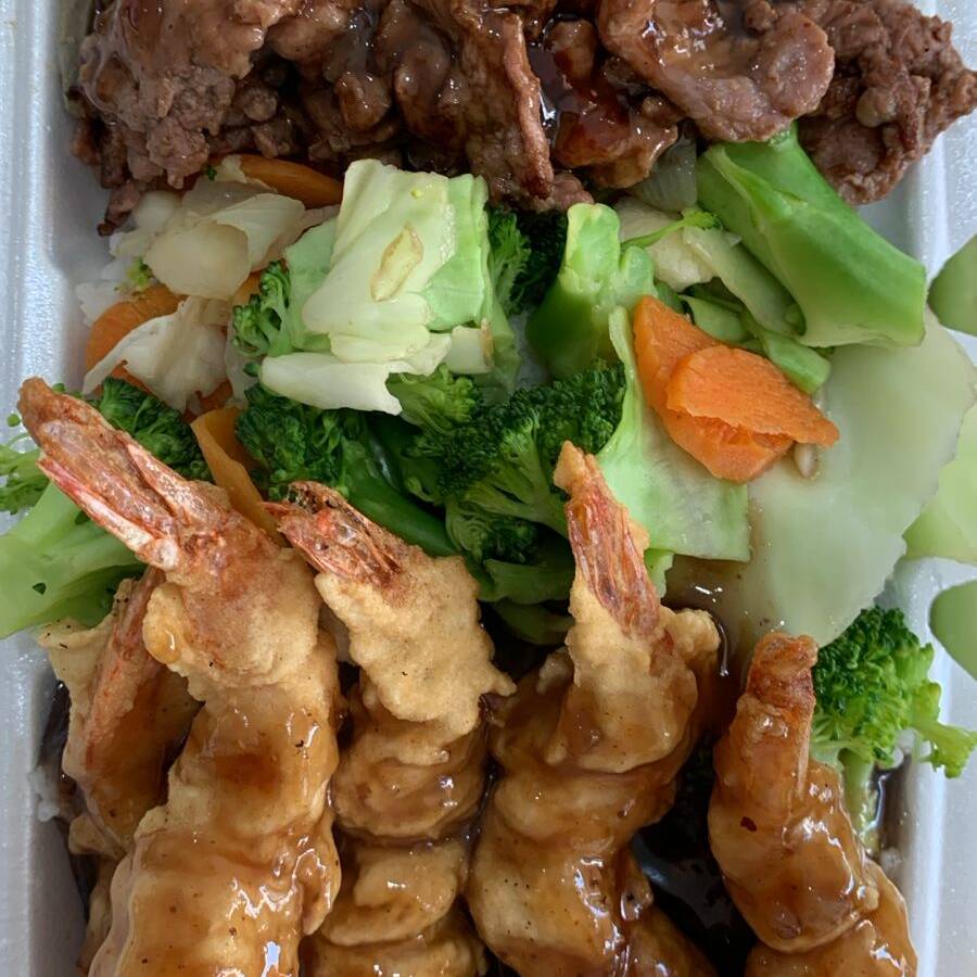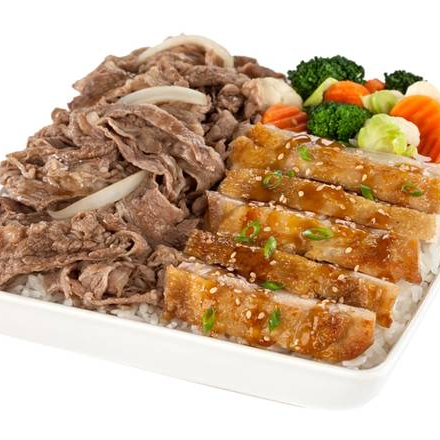 Combo Pollo Res, con una base de Arroz Gohan, Filete de Pollo a la Plancha y Tiras de Carne de Res, sazonada con vino de Arroz, acompañado con Vegetales estilo California y bañado con Salsa Teriyaki agridulce.