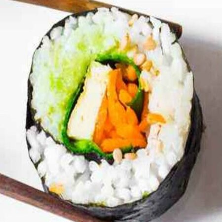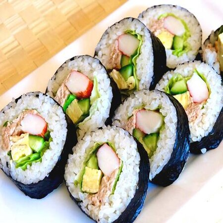 Rollo Clasico con Alga por fuera y adentro, Surimi, Queso, Pepino, Aguacate y Aderezo Tampico