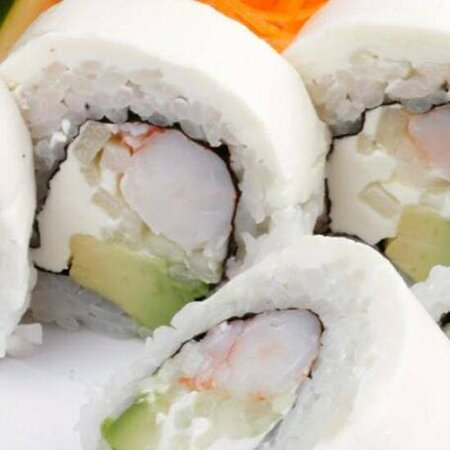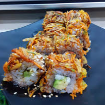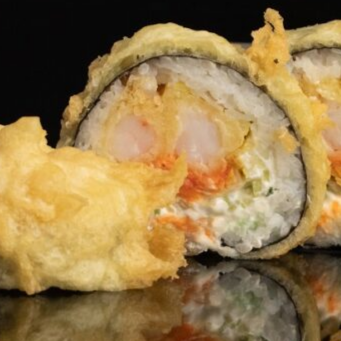 Sushi relleno de Camarón, Queso Pepino y Aguacate, Rebosado con Harina Tempura y bañado con Salsa de Anguila
