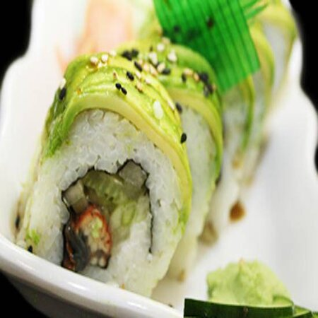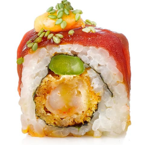 Sushi Natural forrado de Atún Rojo, adornado con Salsa Chipotle, por dentro, Camarón empanizado, Queso Filadelfia, Pepino y Aguacate, bañado con Salsa de Anguila