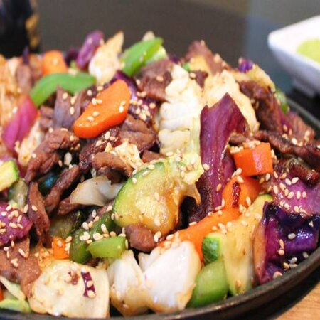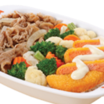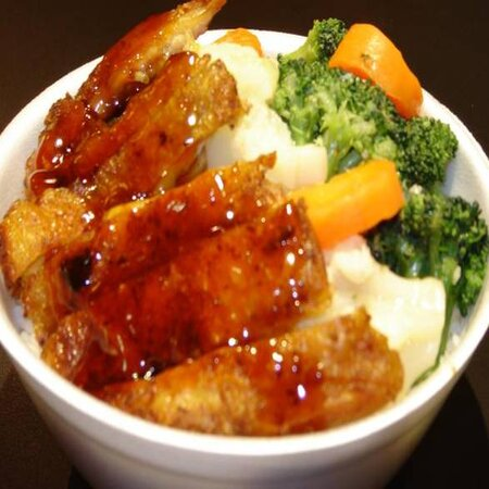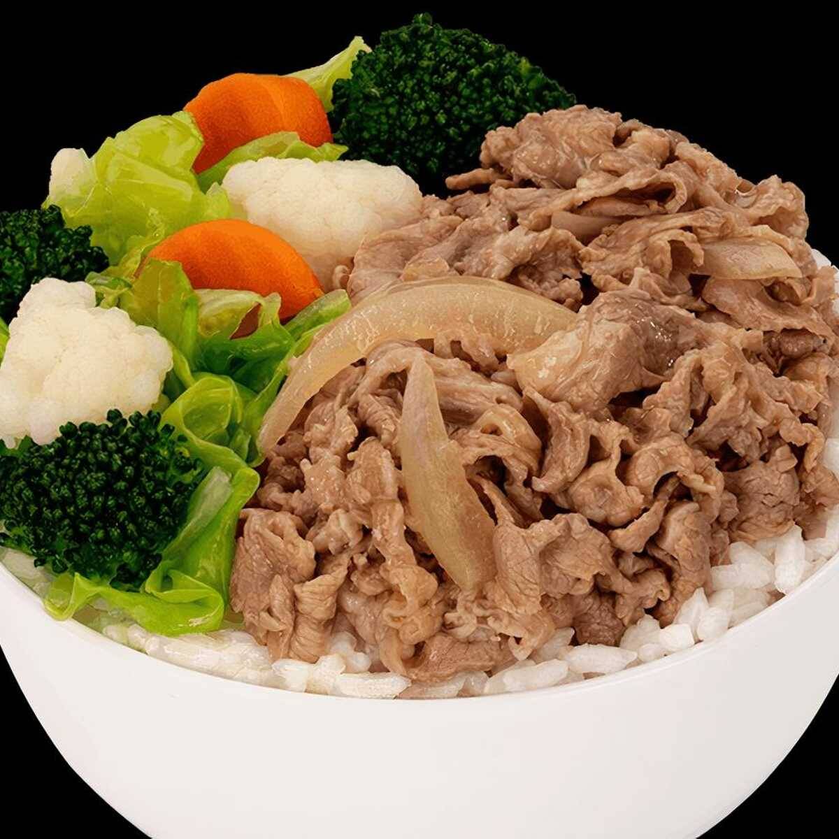 Platillo con una base de Arroz Gohan, Carne de Res cortada en tiras, sazonada con Vino de Arroz, Cebollas frescas, acompañado con Vegetales a vapor estilo California y bañado con Salsa Teriyaki