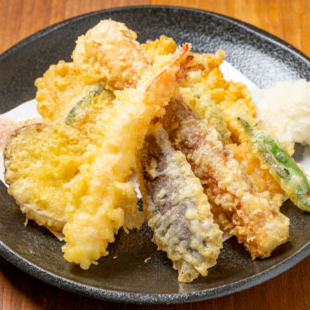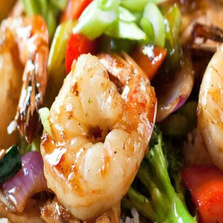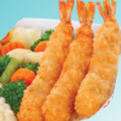 Platillo con una base de Arroz Gohan, acompañado de Camarones rebosados Tempura y Vegetales a Vapor, bañados con Salsa Teriyaki