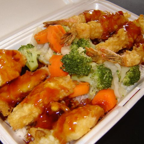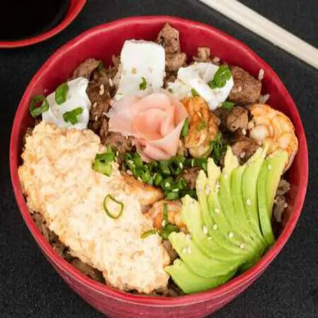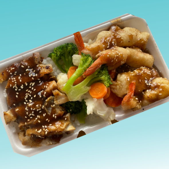 Platillo con una base de Arroz Gohan. arriba Filete de Pollo a la plancha, Camarónes Tempura, Vegetales a Vapor estilo California y Bañados con Salsa Tempura y Teriyaki