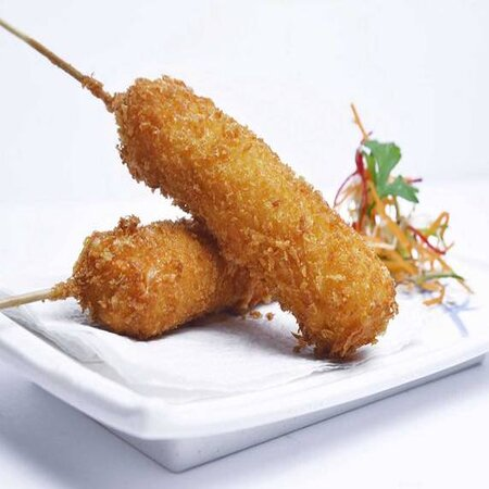 Brocheta de Camarón cocido y Queso Manchego, acompañada con Salsa Teriyaki ( Una Pieza )