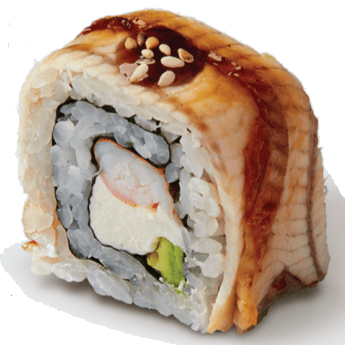 Sushi Natural forrado de Anguila ahumada, bañado con Salsa de Anguila, por dentro, Camarón, Queso, Pepino y Aguacate